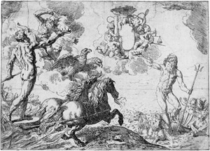 Jupiter, Neptun und Pluto bieten ihre Kronen dem Wappen des Kardinals Barberini an. Radierung. 30,1 x 43,3 cm. B. 29 III, Bellini IV. Wz. Dreigeteilter Kreis mit Sternen.