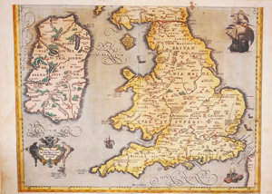 Ortelius, Abraham. Reliqua Britannicarum Insularum. Kolorierte Kupferkarte aus dem "Theatrum Orbis Terrarum", gedruckt von zwei Platten und zusammenmontiert. Blattgröße ca. 38,5 x 55 cm. Unter Passepartout. 50 x 59,5 cm. Antwerpen ca. 1590.