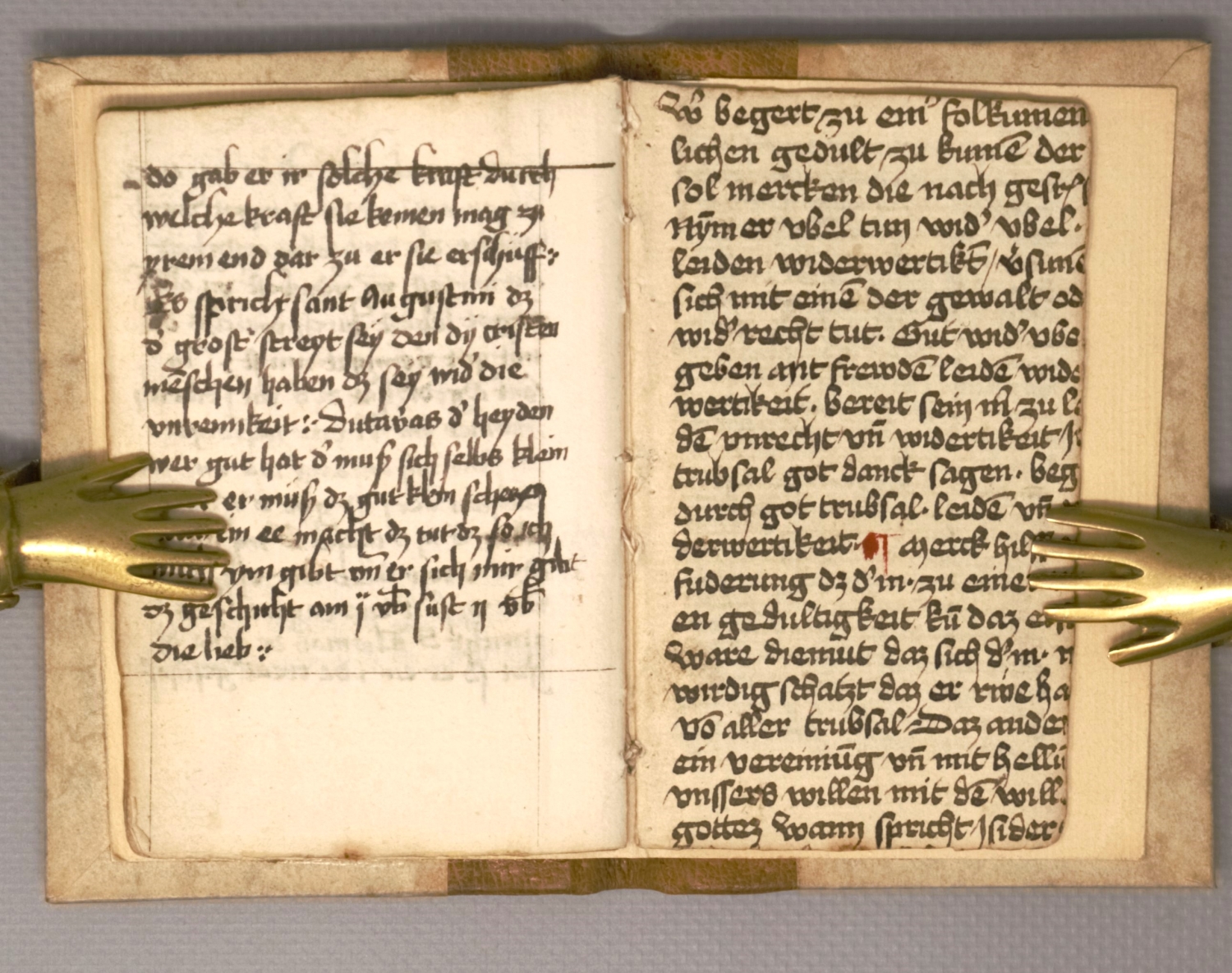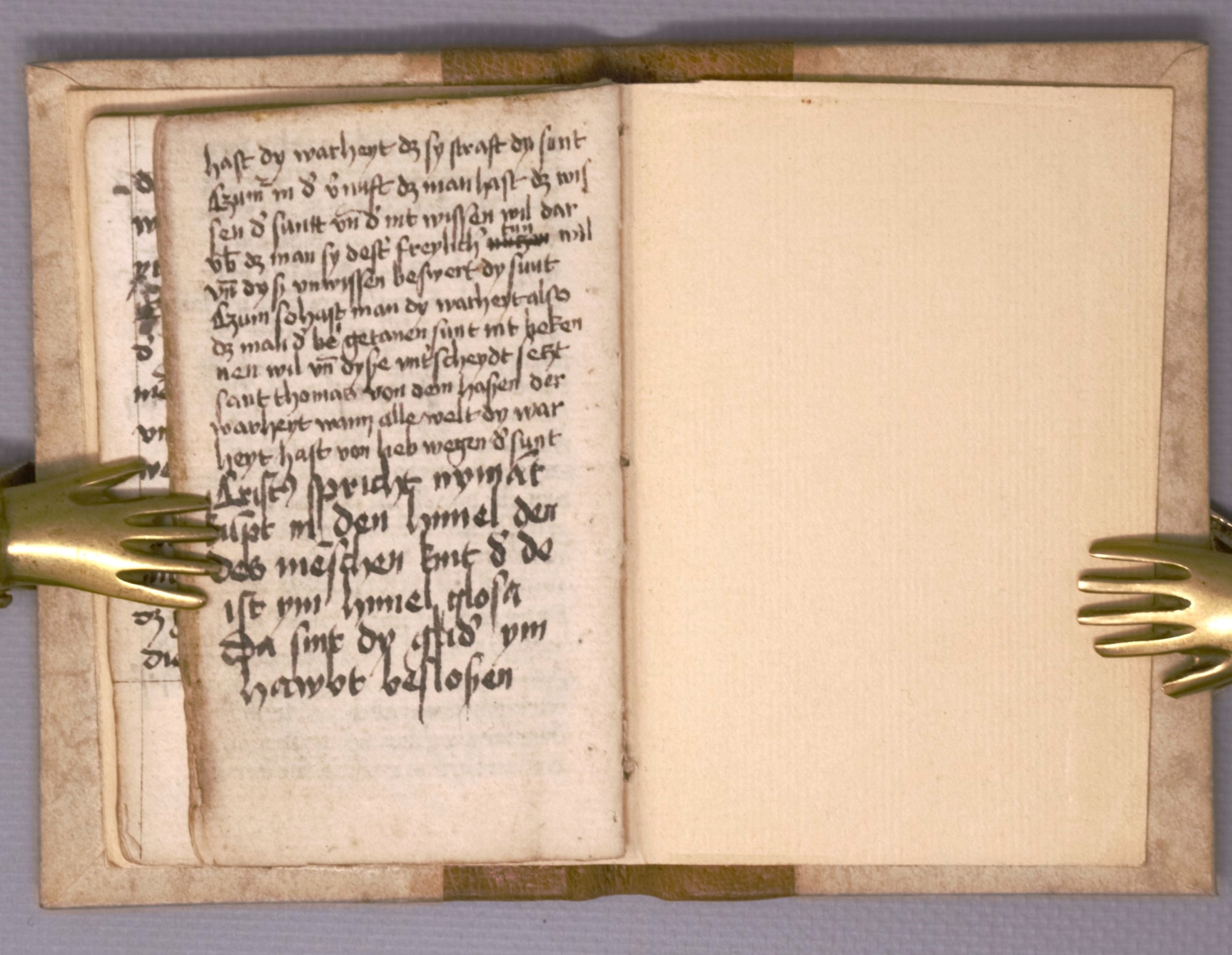 Muleysen, Johannes, Friedrich Stromer und Johannes Diemar. Nürnberger Predigten, Fragment einer Handschrift aus dem Dominikanerinnenkloster St. Katharina in Nürnberg, entnommen aus Hs. 114 der Sammlung Gerhard Eis. Das Fragment befand sich dort hinter Bl. 142. Deutsche Handschrift auf Papier, 22 Bl. Bastarda von mehreren Händen (Nürnberger Dominikanerinnen). Schriftraum und Zeilenzahl wechselnd. Format: 10 x 7 cm. Gut erhalten. Modernes Halbleder. Nürnberg, Dominikanerkloster St. Katharina, 1478-1492.