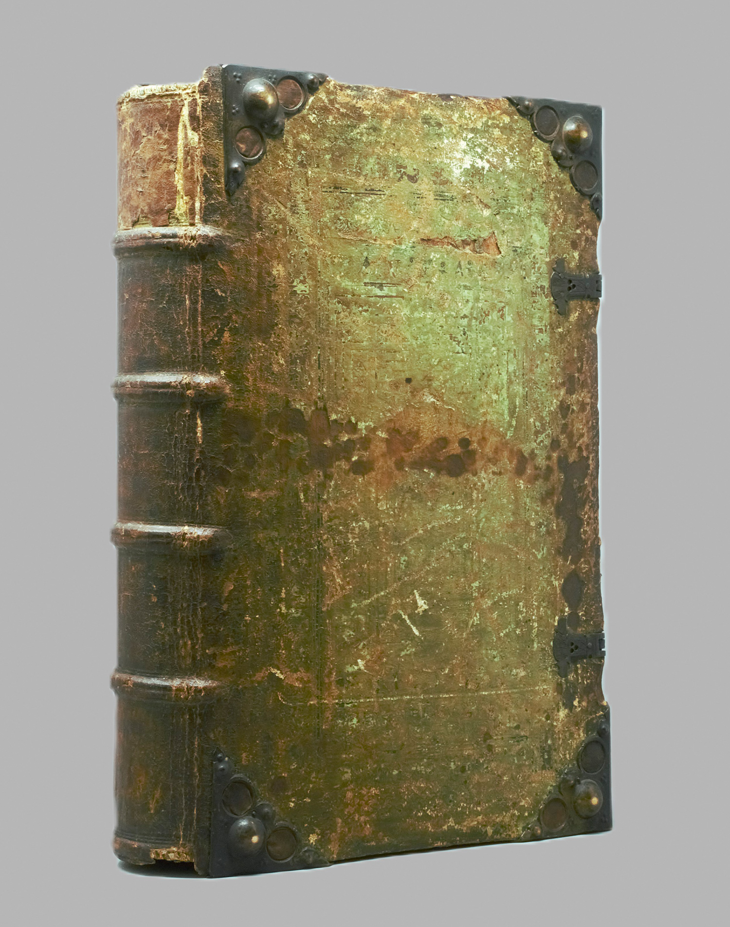 Luther, Martin. Der Achte Teil der Bücher des Ehrnwirdign Herrn ... darinnen die verdeudschte Auslegunge begriffen oder die Psalmos graduum und den 110 Psalm, ... Teil VIII (von XII). 6 nn. Bl., 508 num. Bl. Mit Holzschnitt-Titelvignette. Titel in Rot und Schwarz. 30 x 19 cm. Grünes Leder d. Z. (stark berieben, mit Fehlstellen und Einrissen) über Holzdeckeln mit 8 Messingbeschlägen und 2 Messingschließen. Wittemberg, Hans Lufft, 1556.