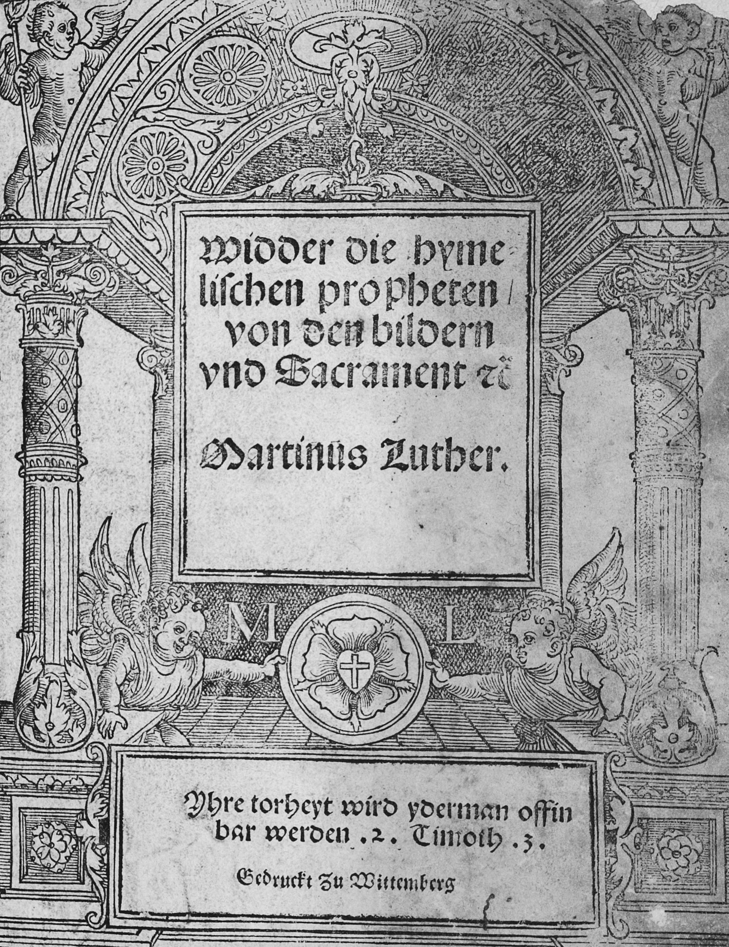 Luther, Martin. Widder die hymelischen propheten von den bildern und Sacrament. 44 Bl. Mit großer, figürlicher Holzschnitt-Titelbordüre. 20 x 13,5 cm. Modernes Leder (minimal berieben) mit goldgeprägtem RSchild. Wittemberg, o. Dr. und J. (Lukas Cranach und Christian Döring,1525).
