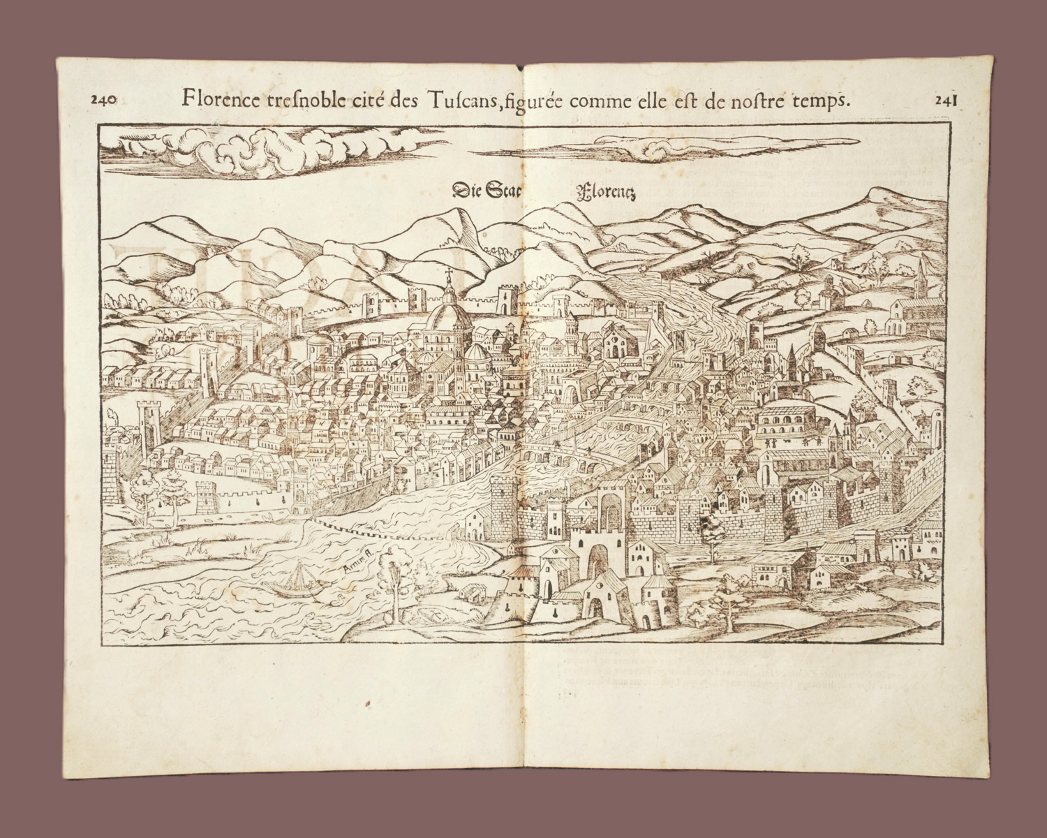 Münster, Sebastian. Florence tres noble cite des Tuscans, figurée comme elle est de nostre temps. Die Stat Florentz. Holzschnitt-Karte aus der "Cosmographiae universalis Lib. VI". Mit französischem Rückentext. 22 x 35,5 cm (Darstellung). Um 1550.