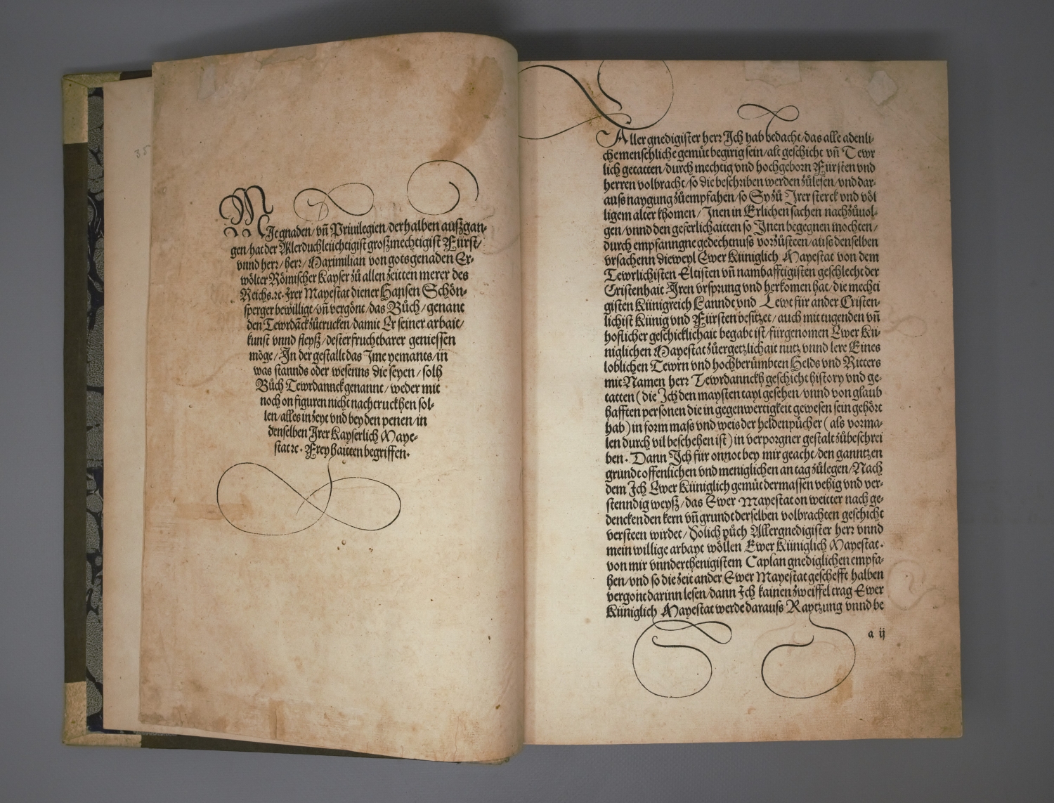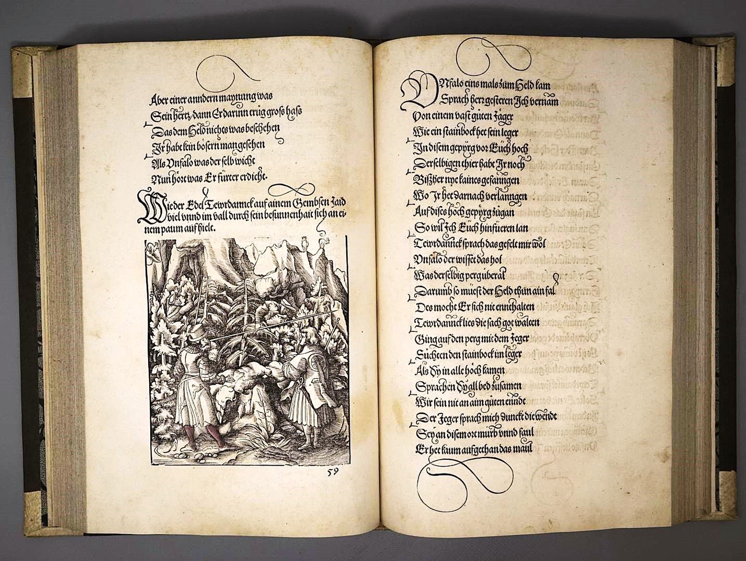 VD16 M 1651. Adams P 963. Fairfax-Murray 330. Lipperheide Cg 12. Dodgson I, 509, 19 und II, 58, 7. Oldenbourg L 120. Hollstein V, 112. Brunet V, 767f. – Zweiter Druck der zweiten Auflage des wohl aufwendigsten deutschen Holzschnittbuches des 16. Jahrhunderts. Während der erste Druck von 1517 von Kaiser Maximilian I. bekanntlich fast ganz zu Geschenkzwecken gebraucht wurde, war die vorliegende zweite Auflage ausschließlich zum Verkauf bestimmt. Für das von Maximilian in Auftrag gegebene und von dem Nürnberger Probst Melchior Pfintzing (1481-1535) poetisch gestaltete Werk, wurde eigens eine Drucktype mit ornamentalen Ober- und Unterschleifen aus der damaligen Kanzleischrift entwickelt, die als Vorläufer der Fraktur gilt (vgl. Arnim, Fünf Jahrhunderte Buchillustration, 70). Das vom kaiserlichen Sekretär Treitzsaurwein geordnete Werk erzählt allegorisch unter der Handlung einer Brautfahrt die Lebensgeschichte des Kaisers Maximilian I., sowie von Turnieren und Festlichkeiten des ausgehenden Mittelalters, welche mit diesem Werk eine kategorische quasi romantische Wiederbelebung erfuhr. – Das leere Blatt P5 fehlt, D1 und D8 verso mit Wasserfleck, keine anderen Blätter betroffen. Blatt a4 vor a3 gebunden. Lediglich 27 der Holzschnitte wurden meist in Violett, selten in anderen Farben ankoloriert, möglicherweise sollte das ganze Exemplar koloriert werden. Durchgehend etwas wurmlöchrig (minimaler Text- und Darstellungsverlust), teils stärker finger- und braunfleckig. Blätter ab und an gebräunt. Der Titel und 7 weitere Blätter hinterlegten Ein- und teils auch Ausrissen. Breitrandig beschnitten, bis auf den Kopfsteg, dieser selten mit minimalem Verlust der oberen Schriftschnörkel.
