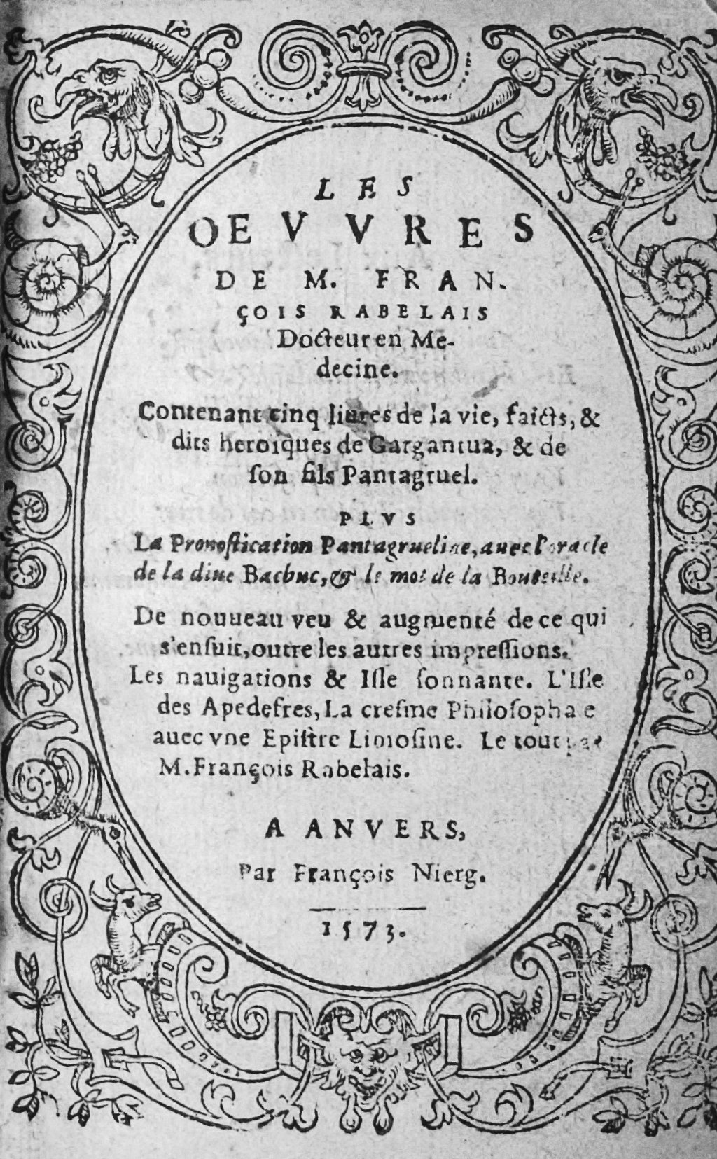 Tchemerzine V, 311. Brunet IV, 1057. Rawles-Screech 67. – Erster Nierg-Druck des unter dem Obertitel "Les Oeuvres" veröffentlichten berühmten Romanzyklus Gargantua und Pantagruel, der Erstdruck erschien in fünf Bänden von 1532 bis 1564. Vorhanden sind alle fünf Bände, die Paginierung gliedert den Druck jedoch in nur drei Teile. Bis auf den Teil IV ist jeder Teil mit einem eigenen Titelblatt ausgestattet (der Teil I beginnt mit dem Haupttitel). "Edition extremement rare, décrite pour la première foit par M. Plan; elle est très bien imprimée, reproduit ligne par l'édition de Peirre Estard. 1571" (Tchemerzine). – Etwas braunfleckig.