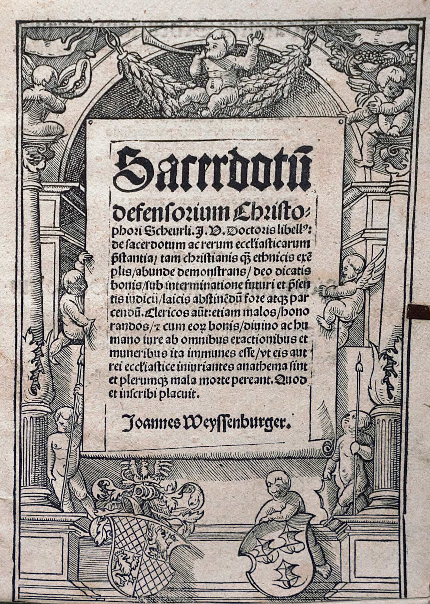 Scheurl, Christoph. Sacerdotum defensorium libellus de sacerdotum ac rerum ecclesiasticarum praestantia. 14 Bl. Mit figürlicher Holzschnitt-Titelbordüre. 18,8 x 14 cm. Modernes Halbpergament. (Landshut), Johann Weyssenburger, (1516).
