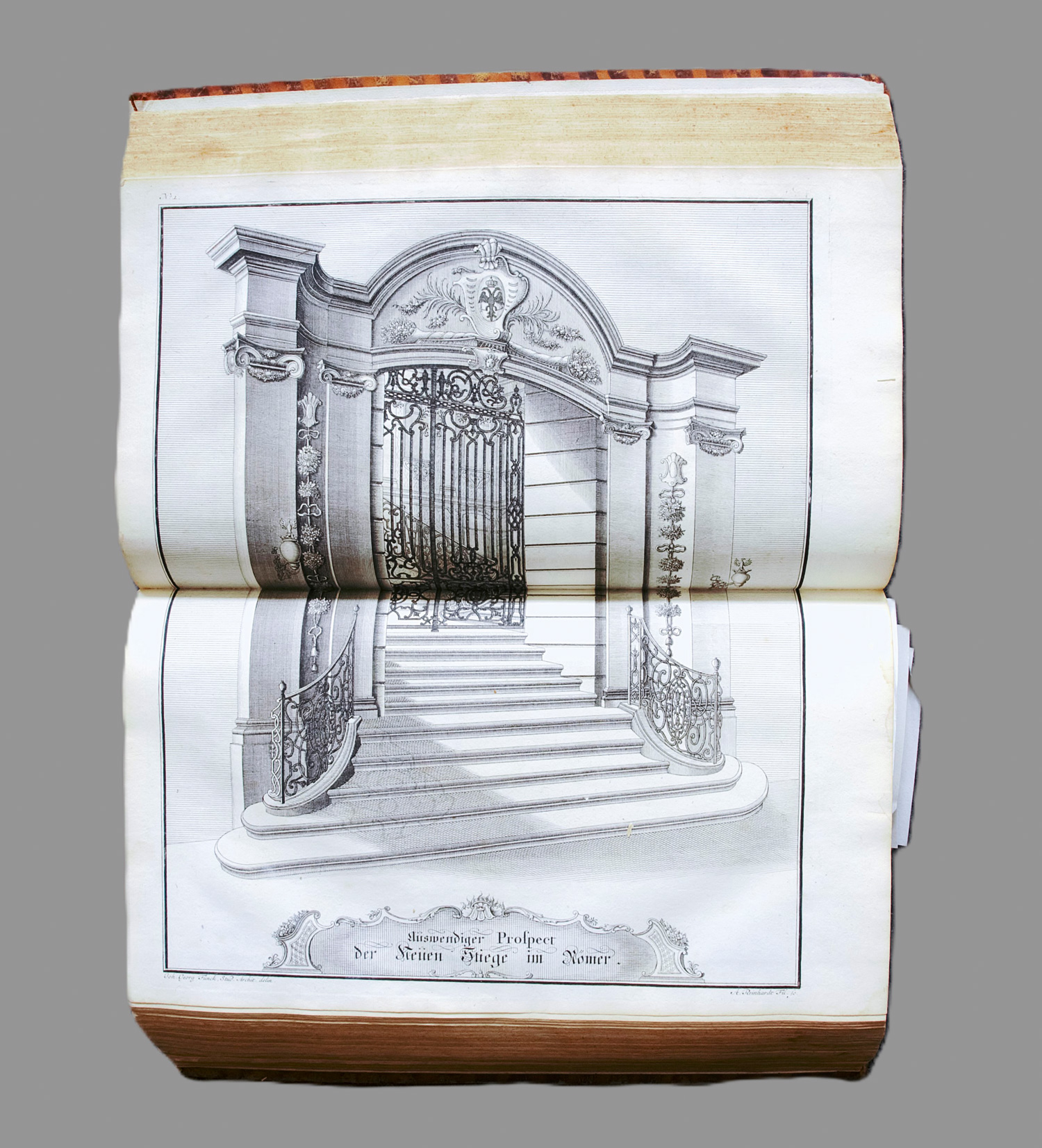 Lipperheide II, Sba 31. Ornamentstichkat. Berlin 2904. Vinet 687. VD18 14657988-001. Sauer, Francofurtensien, 255. – "Das umfangreichste und neben dem Krönungs-Diarium für Leopold I., das schönste Diarium, welches in Frankfurt am Main erschienen ist" (Sauer). - Unter den Kupferstichen finden sich prachtvolle Ansichten von Römerberg und Roßmarkt, ergänzt durch Darstellungen der Festzüge, des Krönungsbanketts und weiterer Feierlichkeiten etc. – Stellenweise mit leichtem Wasserrand, kaum stockfleckig. Die imposante Falttafel mit dem Einzug von Franz I. zur Frankfurter Krönung 1745 zeigt verso einen Wasserrand sowie einen größeren Einriss, der verso mit Papierklebestreifen hinterlegt wurde. Die übrigen Tafeln befinden sich sämtlich in schöner Erhaltung. Vortitel mit Braunfleck. Insgesamt - abgesehen von der lädierten Falttafel sowie vereinzelten kleinen Läsuren und Flecken - ein wohlerhaltenes und schönes Exemplar.