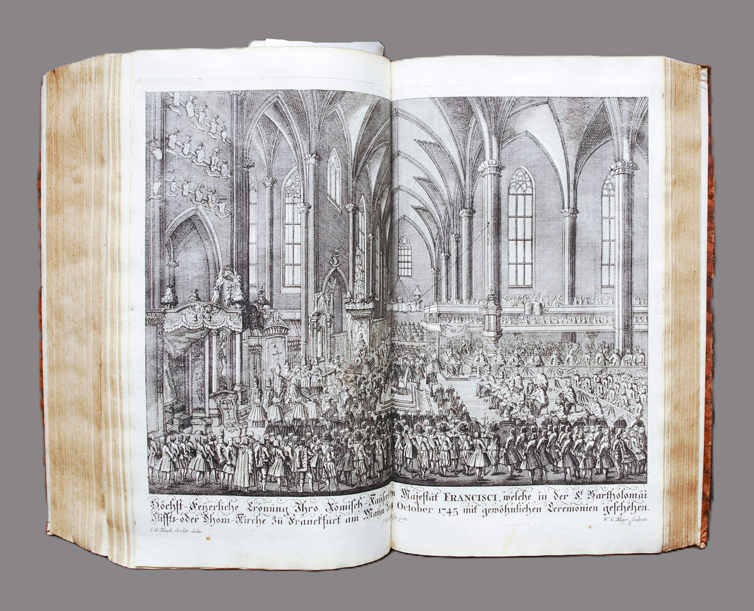 Franz I., röm.-dt. Kaiser. Vollständiges Diarium von der höchst-beglückten Erwehlung (Crönung) des allerdurchlauchtigsten großmächtigsten und unüberwindlichsten Fürsten und Herrn, Herrn Franciscus Königs zu Jerusalem. 2 Teile in 1 Band. 51 Bl., 276, 36 S.,1 Bl., 26 S., 2 Bl., 56 S., 5 Bl., 30 S.; 25 Bl., 200 S., 1 Bl., 78 S., 1 Bl., 54 S., 16 S., 1 Bl., 38 S., 24 Bl. Mit 1 gestochenem. Frontispiz, 18 doppelblattgr. oder gefalt. Kupfertafeln, 20 ganzseitigen Porträtkupfern, 4 gefalt. Tabellen bzw Plänen, davon 1 gefalt. genealogische Tabelle und einigen Textkupfern. 35 x 21,5 cm. Kalbsleder d. Z. (stärker berieben und fleckig, mit Schabspuren und Bestoßungen, am oberen Kapital mit Fehlstelle) mit RSchild (RTitel verblasst). Frankfurt, Johann David Jung, 1746-1747.