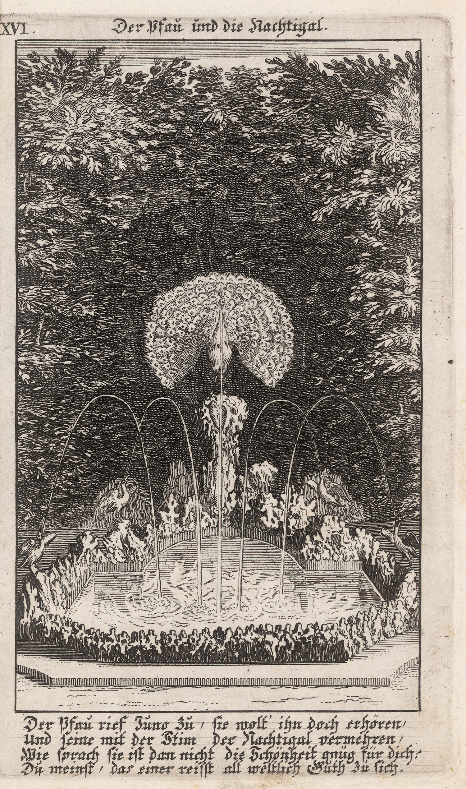 VD17 12:644437V. – Seltene deutsche Ausgabe der (beschnittenen) Stichfolge nach der französischen Erstausgabe, die 1677 in der Imprimerie Royale in Paris unter dem Titel Labyrinte de Versailles erschien, hier allerdings nur die Kupfer ohne den dazugehörigen Text mit den Fabeltexten auf Französisch und Deutsch. Die heute nicht mehr erhaltenen prächtigen Springbrunnen aus dem Labyrinth von Versailles wurden auf Anregung Charles Perraults (1628-1703) von Sebastian Le Clerc (1637-1714) in Kupfer gestochen, Perrault verfasste dazu die erläuternden Texte und Isaac de Benserade (1612-1691) die metrischen Vierzeiler mit Sinnsprüchen nach Jean de la Fontaine und den Fabeln Äsops. In der deutschen Ausgabe liegen hier jedoch nur die Kupfer vor ohne den Text von Perrault, die Vierzeiler in deutscher Übertragung sind abweichend zu den französischen Ausgaben mit in die Platte gestochen. Das seinerzeit berühmte und reich ausgeschmückte Labyrinth entstand zwischen den Jahren 1672 und 1681 im Petit Parc des Schlosses und erstreckte sich auf eine Fläche von mehr als einem Hektar. Alle errichteten 39 Springbrunnen waren farbig bemalt, die aus Bleiguss gefertigten Tiere symbolisierten Themen aus den Fabeln des Äsop. Im Unterschied zu anderen Labyrinthen des Barock bestand das Ziel darin, den Weg hindurch so zu wählen, dass alle Brunnen einmal besucht und bestaunt wurden. Im Rahmen einer Neugestaltung der Parkanlage wurde das Labyrinth 1774 entfernt. Die erste Tafel (außerhalb der nummerierten Folge) mit dem Titel "Eingang des Irrgartens" im Plattenrand beschnitten, ankoloriert und aufgezogen. – Es fehlt der gestochene Titel mit dem Plan des Labyrinths. Vereinzelte geringe Flecken, Vorsatz mit hs. Besitzeinträgen.