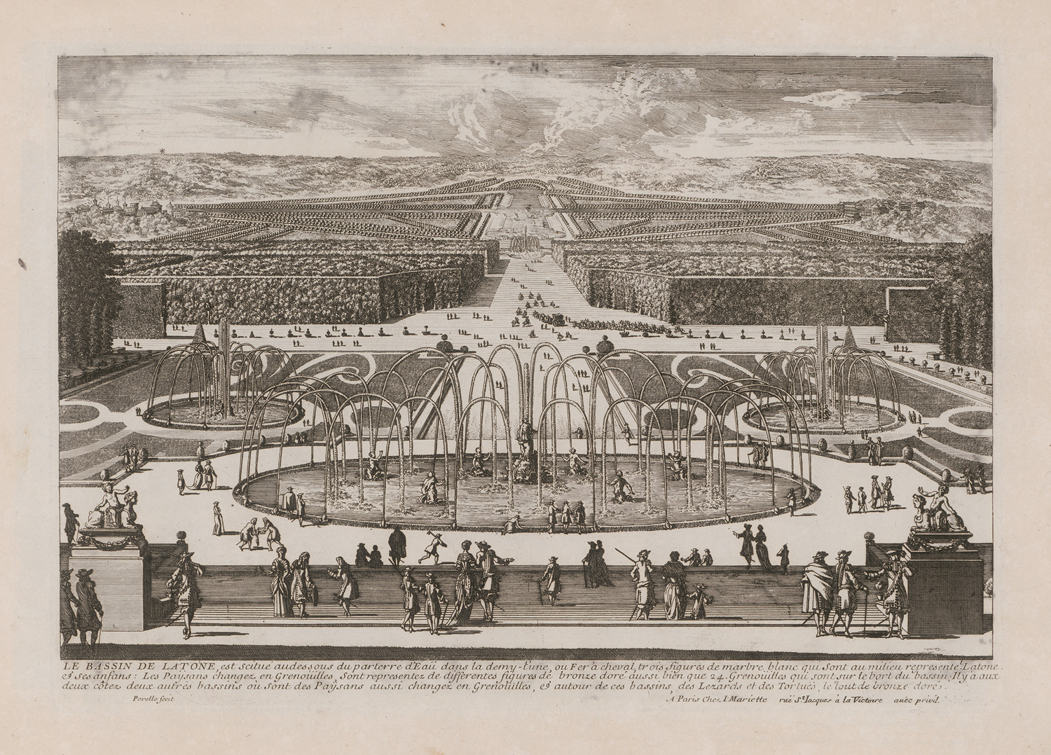 Vgl. Ornamentstichkatalog 2483 (mit ähnlicher Zusammenstellung). Thieme-Becker XXVI, 401. – Enthält Stiche aus den Folgen "Veues des belles maisons des environs de Paris", "Veues des plus beaux endroits de Versailles" u. a. Mit vielen Ansichten der Gärten und dem Schloss von Versailles (teils aus der Vogelschau), ein gefalteter "Plan General des Ville et Château de Versailles", "La Labyrinte de Versailles" etc. – Teils leicht fleckig, ein Faltplan mit kleinem Riss, eine Tafel mit Randeinriss, eine Tafel im Rand leicht knickfaltig. Aus der Bibliothek von Schloss Wideville, nordwestlich von Versaille. Mit entsprechendem Wappenexlibris auf dem Innenspiegel und dem goldgeprägtem Buchstaben "W" auf dem Vorderdeckel.