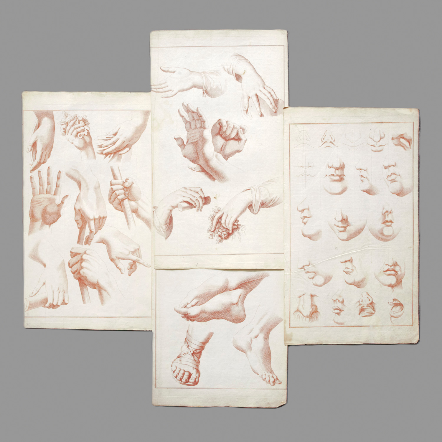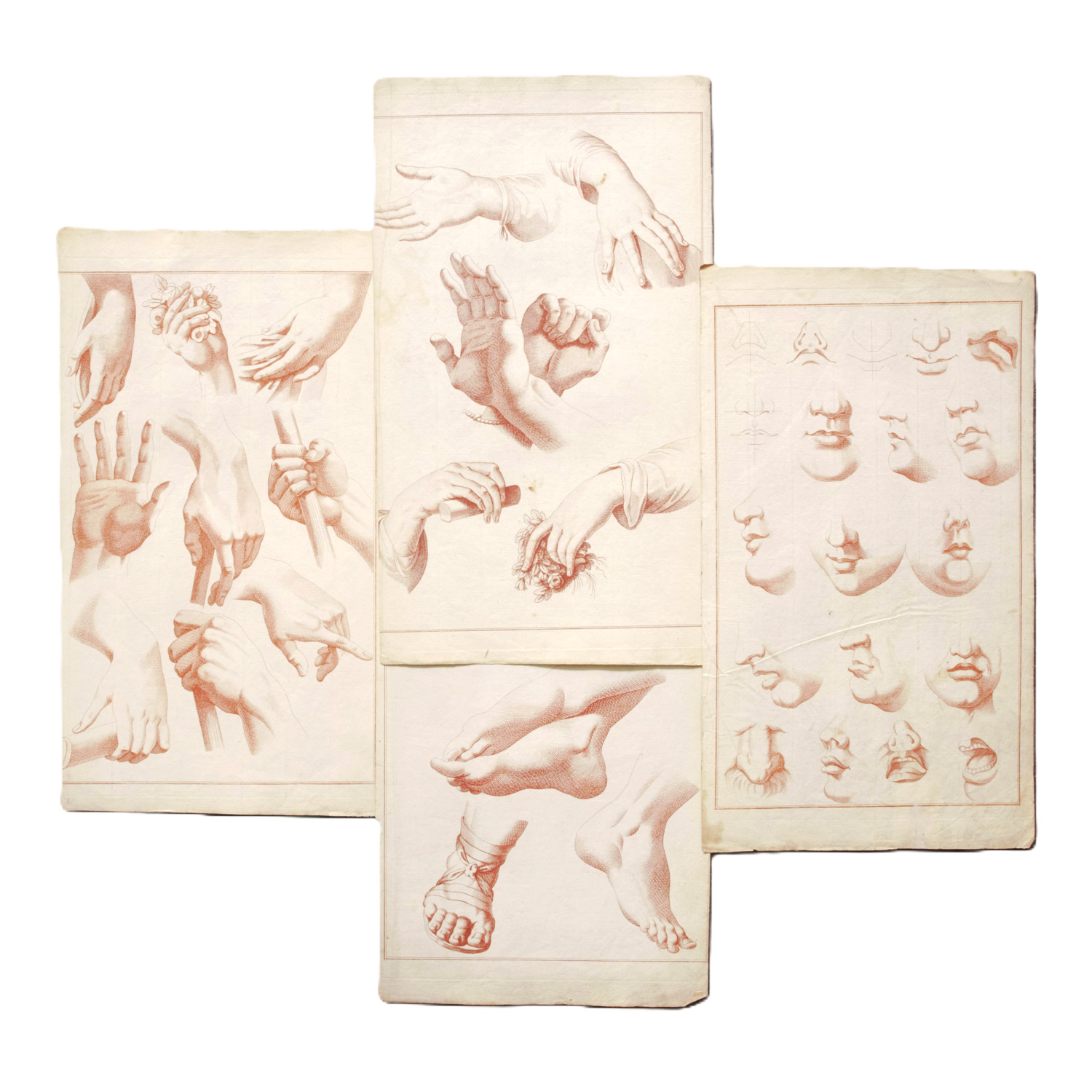 Nicht im Berliner Ornamentstichkat. – Fragmentarisch vorhandene seltene Zeichenschule. Die Tafeln bringen Anleitungen und Vorlagen zum menschlichen Körper, einzelnen Gliedmaßen, Statuen etc. – Mit stärkeren Gebrauchsspuren, Randläsuren und papierbedingt gebräunt.