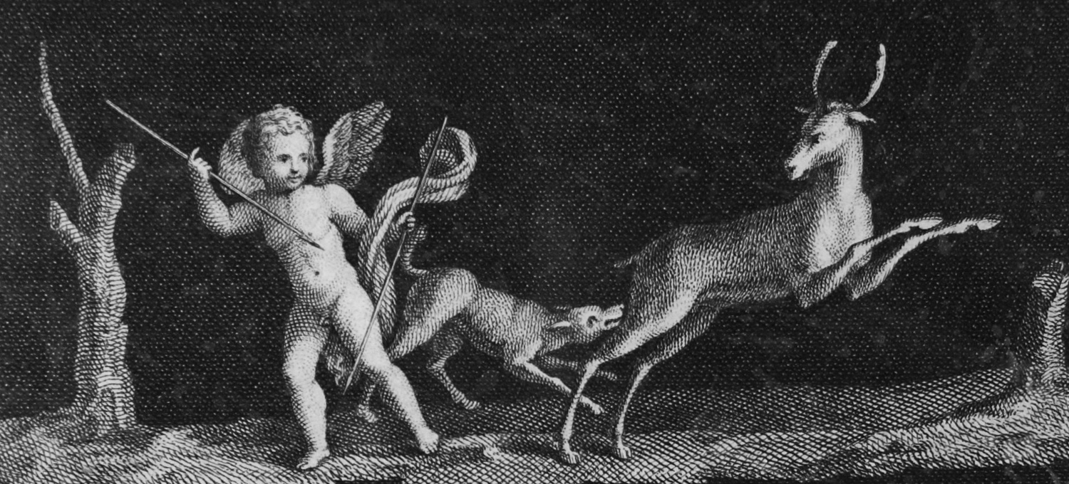 Die Stiche zeigen zwei Stilleben mit Früchten und Büchern sowie Amor mit zwei Hirschkühen und einen Säugling auf einem Jaguar, teils aus dem "Herculaneum". – Knapp beschnitten und etwas stockfleckig. Teils sehr gratig und dekorativ.