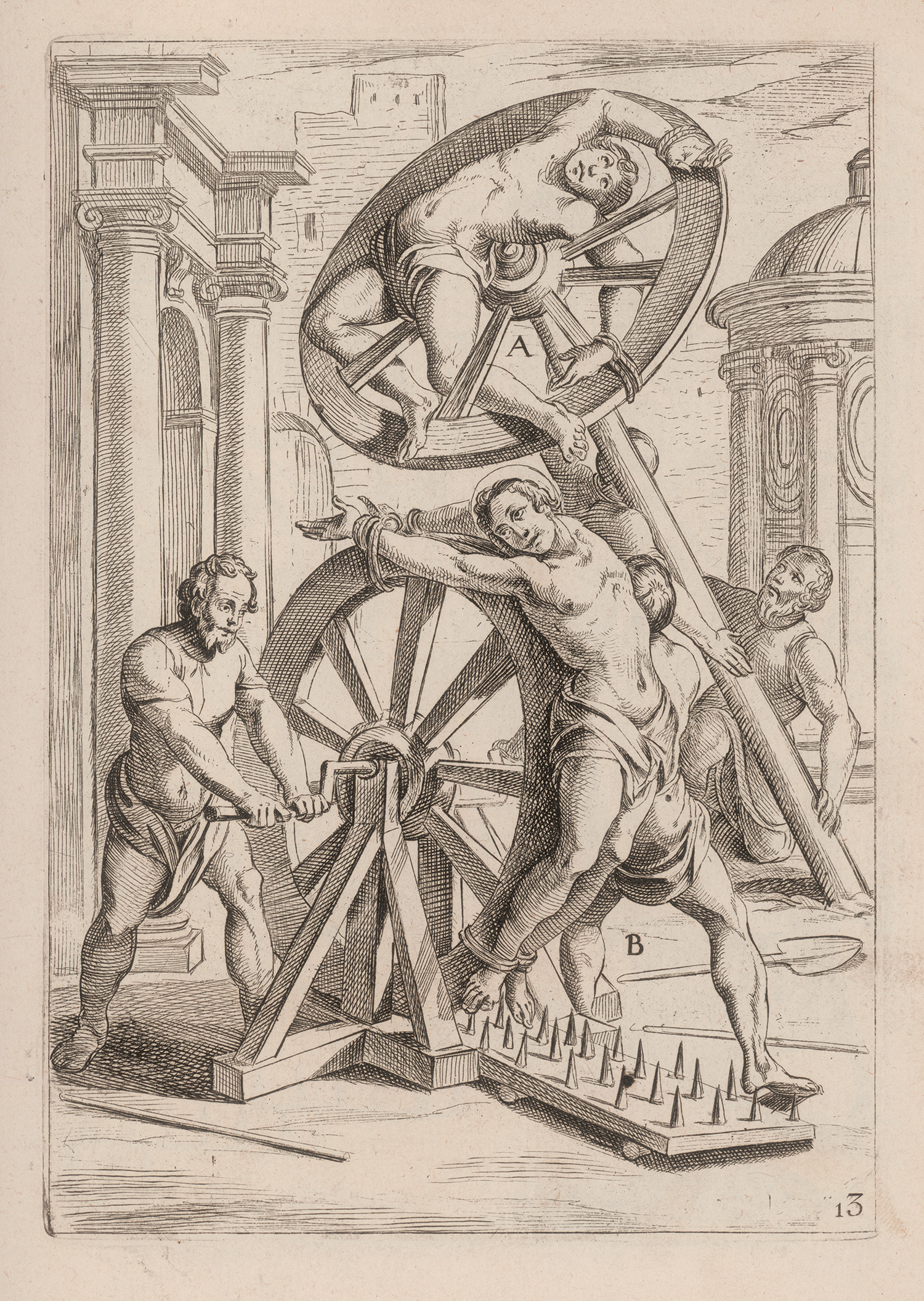 Der letzte Teil stellt allerlei grausame und martyrische Foltermethoden dar nach dem erstmal 1594 in Rom erschienen Werk von dem Priester der Kongregation des Oratoriums von Italien Antonio Gallonio (1556-1605). Die Tafeln zeigen Folterszenen, denen die Märtyrer der Urkirche ausgesetzt waren wie zum Beispiel Kreuzigung, Aufhängung, Auspeitschung, Verbrennung, Enthauptung usw. – Etwas finger- und braunfleckig, sonst sehr schönes und gut erhaltenes Exemplar. Mit teils gratigen und beeindruckenden Stichen.
