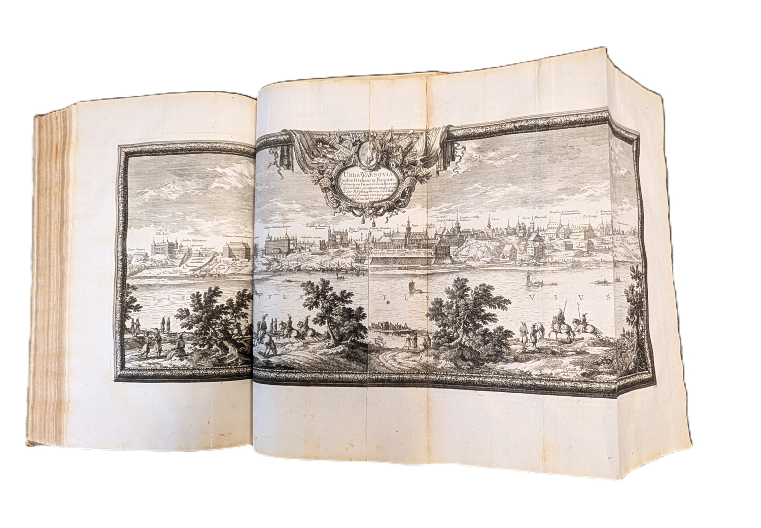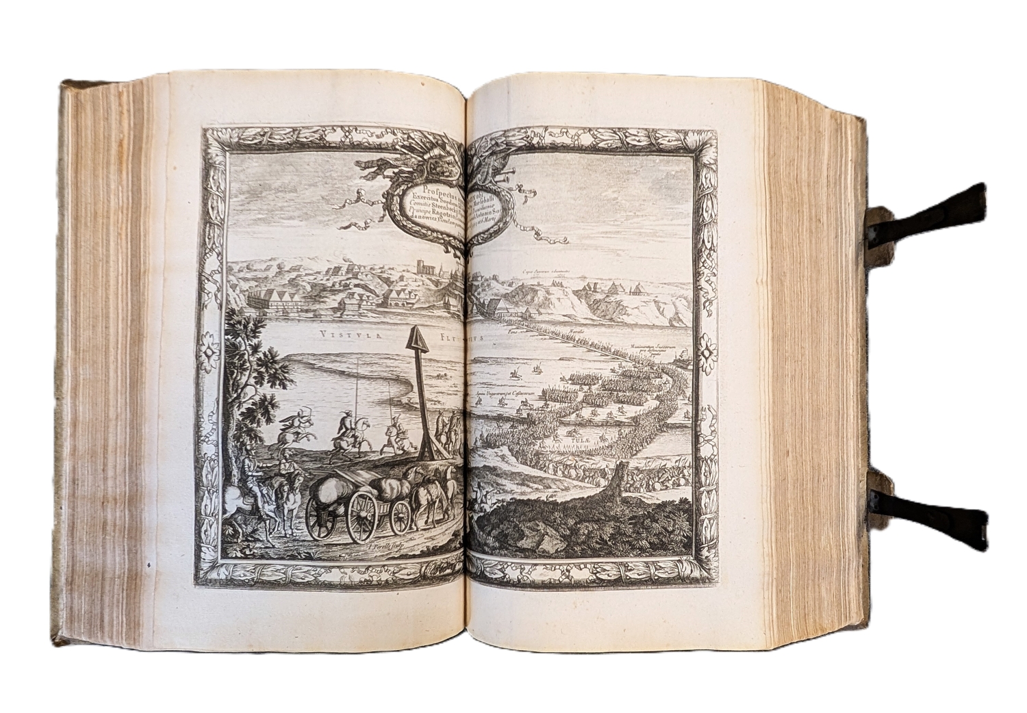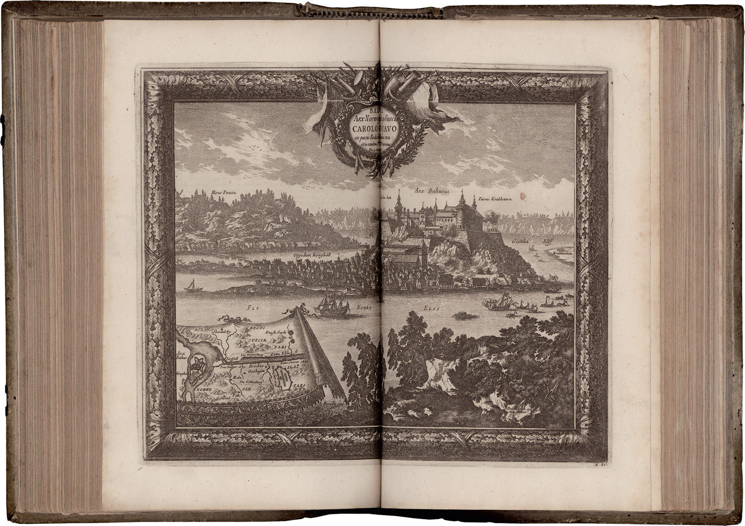 VD17 39:124163A. Ebert 18277. Graesse V, 504. Hiler 727. Vgl. Lipperheide Ci 47 (Ausgabe von 1729). – Erste Ausgabe des Hauptwerks des berühmten Historikers Samuel von Pufendorf (1632-1694). Mit dem Porträt von Karl XI. von Schweden "Carolus XI, suecorum, gothorum, et vandalorum rex" (und den nur einigen Exemplaren beigegebenen weiteren 11 Porträts). Die prächtigen Tafeln zeigen Pläne und Ansichten, Schlachten und Gefechte, Feldlager und Belagerungen, Empfang des türkischen Gesandten, das Treffen der schwedischen und dänischen Majestäten zu Frederiksborg u. v. m. Die Tafeln teils mit schönen Kartuschen, Barockeinfassungen und Staffagen. Unter den Ansichten Sandomir, Danzig, Warschau, Brest-Litowsk, Bromberg, Bremerförde, Mölln, Christianstad, Frederiksborg, Thorun, Helsingborg, Malmö, Greifswald, Cronenburg u. a. Die gewaltig große, meist fehlende Kupfertafel mit der Ansicht der Seeparade vom 3. November 1660 vor Stockholm anlässlich des Begräbnisses des schwedischen Königs Carl Gustav (Karl X.) ist von 12 Platten gedruckt und misst 35 x 450 (!) cm. – Das letzte Blatt und die Tafeln 19, 46, 51, 68, 70-72, 74, 76, 85, 90, 96, 106 und 110 fehlen. Hs. Eintrag im Vorsatz. Ab und an etwas fleckig. Die ersten Blätter mit einem Wasserfleck im Rand. Dieser und teils der Satzspiegel stärker gebräunt, einige der Tafeln betroffen. Ab S. 604 etwas wurmstichig (wenige der Tafeln mit leichtem Darstellungsverlust). Insgesamt gutes und nahezu vollständiges Exemplar.