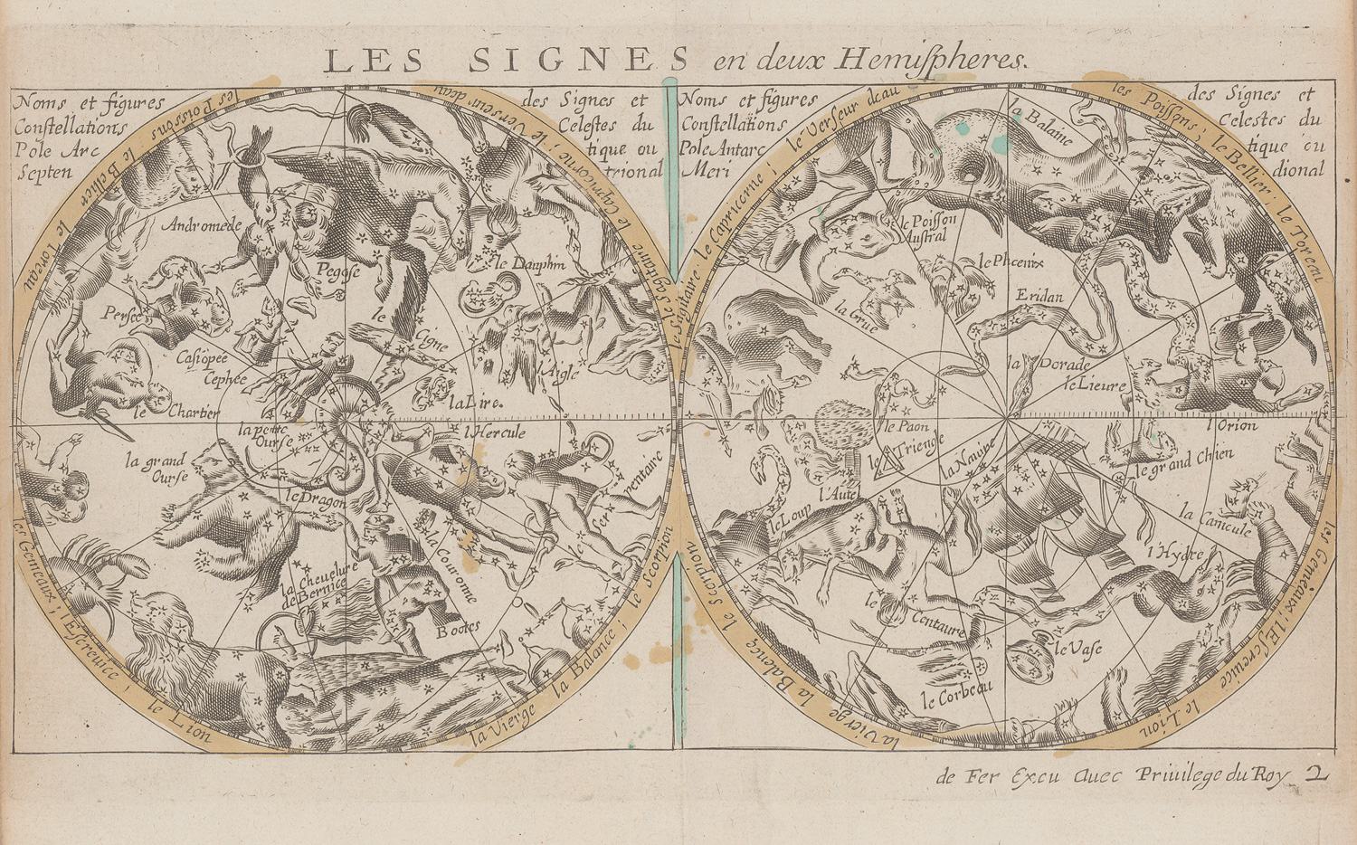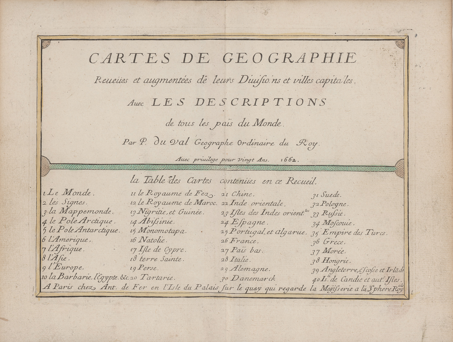 French 406. Nicht bei Henze. – Spätere Ausgabe des vollständigen und sehr seltenen Reiseatlas von dem französischen Kartographen Pierre du Val (1618-1683). Die erste Ausgabe erschien im Jahre 1657. Hier in der französischen Ausgabe, jedoch wurde der Atlas in zahlreiche Sprachen übersetzt. Mit einer Himmelskarte, einer Weltkarte, je einer Nord- und Südpolkarte sowie zahlreichen weiteren Karten der einzelnen Kontinente wie Amerika, Afrika, Europa und Asien, sowie mehrere Länder und Königreiche. Von uns konnte kein weiteres Exemplar gefunden werden. – Vereinzelt minimal braunfleckig und mit winzigen Gebrauchsspuren, sonst sehr gutes Exemplar. Mit sehr schön kolorierten Kupfertafeln in bemerkenswert gutem Zustand.