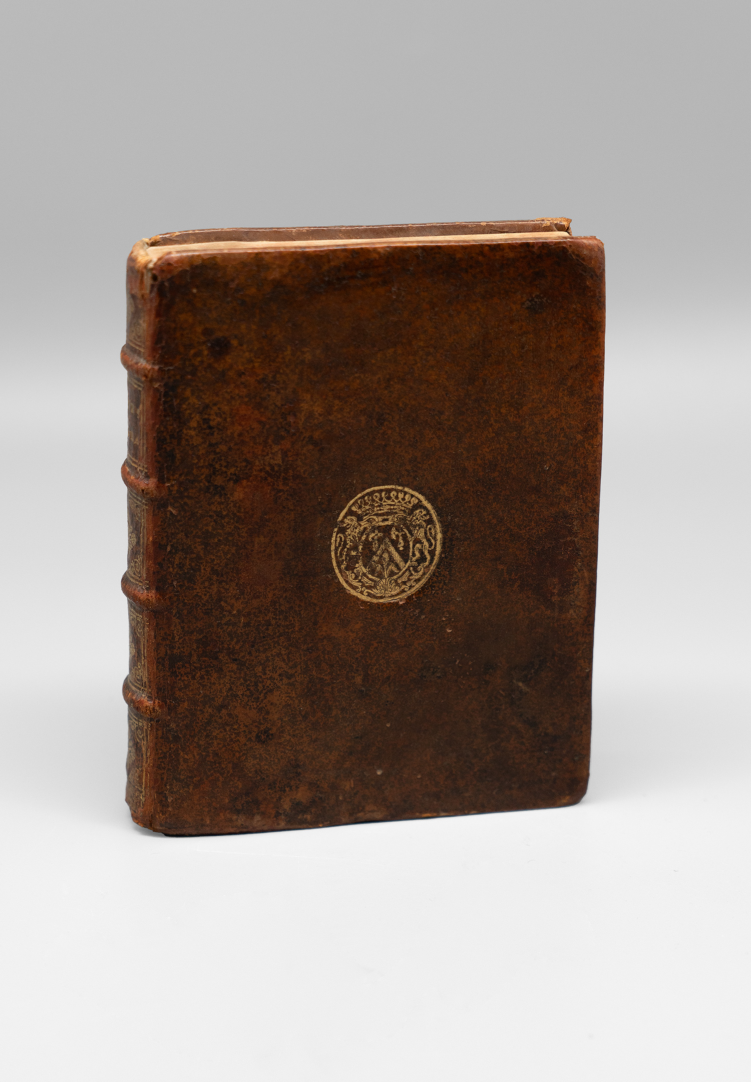 Val, Pierre du. Cartes de géographie reveues et augmentées de leurs division et villes capitales avec les descriptions de tous les pais du monde. Mit gestochenem Titel, 40 doppelseitigen gestochenen Texttafeln und 40 doppelseitigen grenzkolorierten Kupfertafeln. 17 x 12 cm. Kalbsleder d. Z. (etwas berieben und bestoßen Kapitale mit kleinen Fehlstellen und Einrissen) mit goldgeprägtem RTitel und RVergoldung, goldgeprägtem Wappensupralibros sowie goldgeprägten Stehkanten. Paris, P. du Val, 1662.