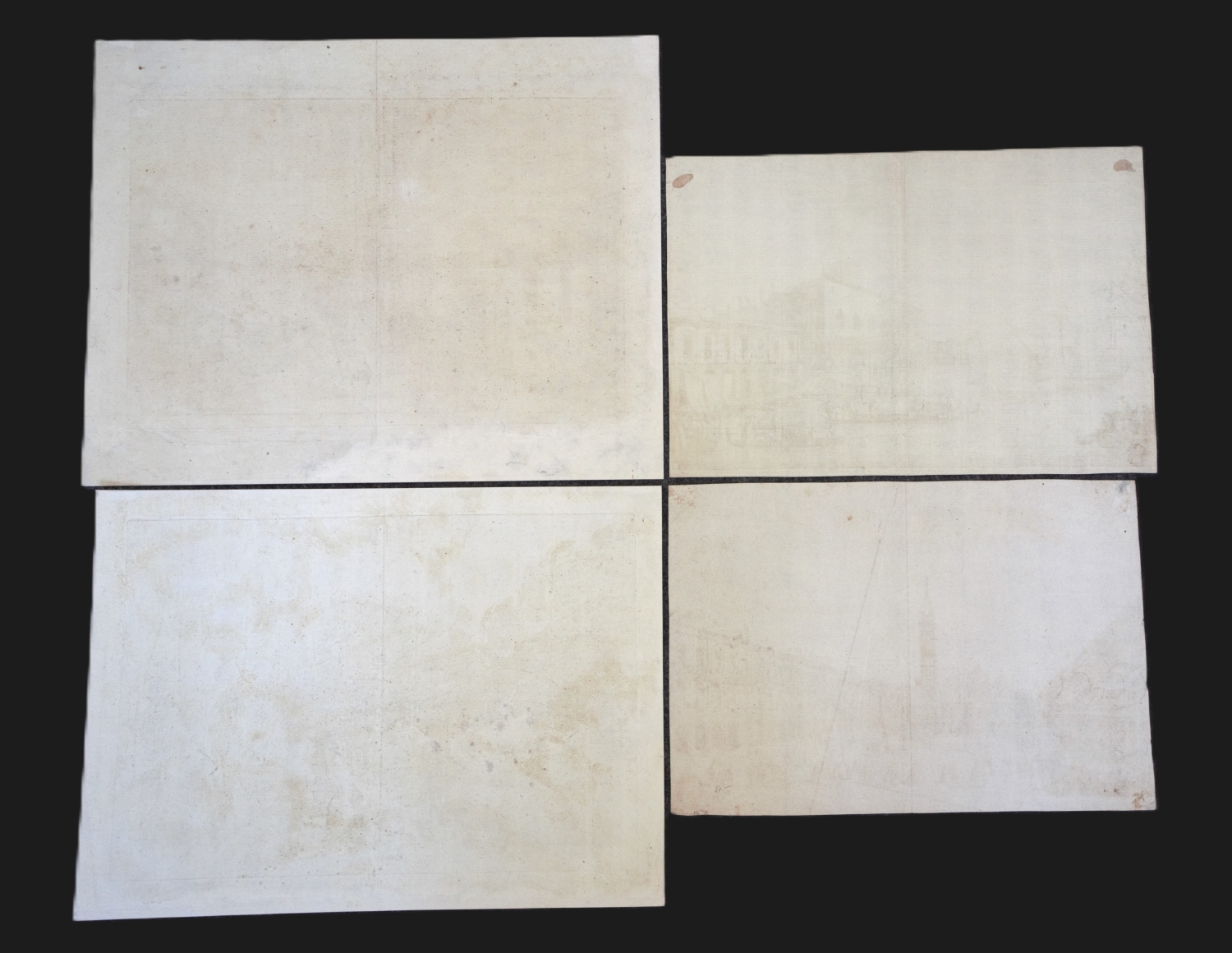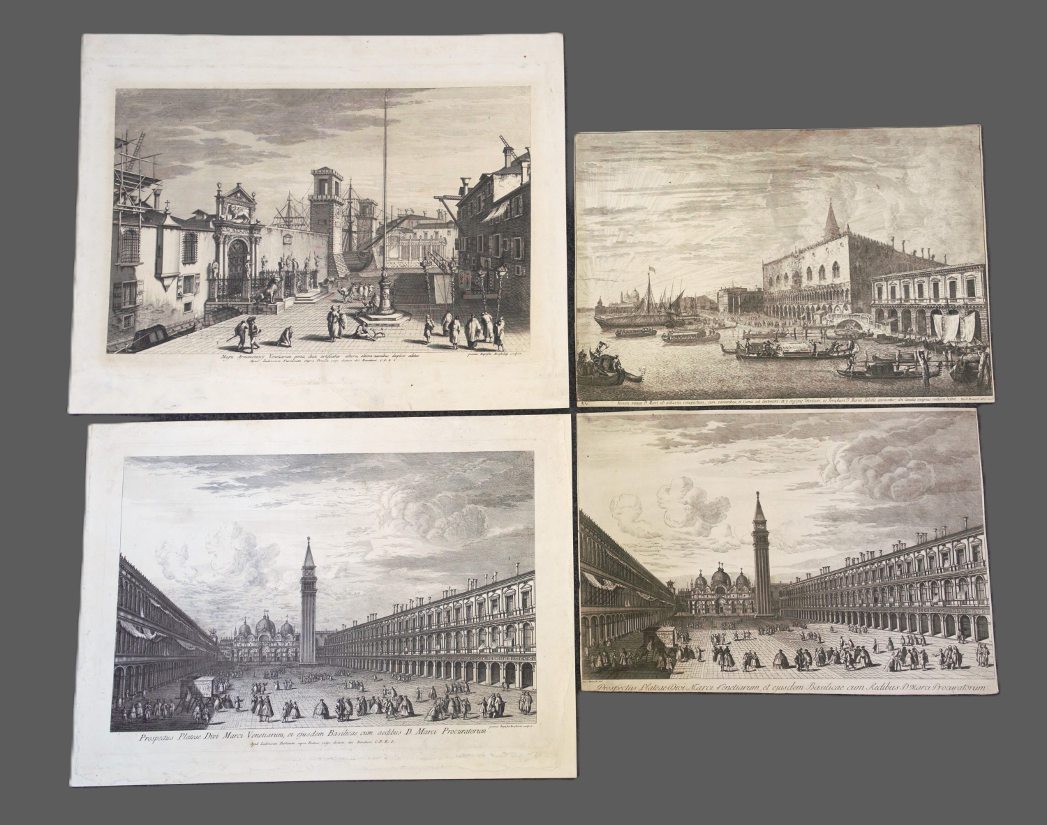 I. Canaletto und Giambattista Brustolon. Magni armamentarij Venetiarum porte du, artificibus altera. Um 1746. - Einrisse hinterlegt. - II. Derselbe und Canaletto. Ex aede salutis, usque ad caput canalis. Um 1751. - III. Dieselben. Magnificum ducale impluvium longe elegantißimum in cuius extrema parte D. Marci Basilicae testudines supereminent. Um 1746. - IV. Michele Marieschi. Forum minus divi marci ab aestuariis conspectum. aus der Folge "Magnificentiores Selectioresque Urbis Venetiarum Prospectus". Nach 1741. - Knapp beschnitten. - V. Derselbe. Prospectus plateae divi marci Venetiarum, et ejusdem basilicae cum redibus D. Marci Procuratorum. Nach 1741. - Zweifach vorhanden in verschiedenen Nachdrucken. - Knapp beschnitten. - VI. Antonio Visentini. Caput canalis et ingressus in urbem. Um 1735. - Hinterlegte Ausrisse. - VII. Derselbe. Hinc ex F. F. discalceatorum templo, illinc ex S. Simeone minore usque ad fullonium. Um 1751. – Einige der Blätter mit hinterlegten Aus- und Einrissen (auch in die Darstellung). Kaum fleckig, gut erhalten.