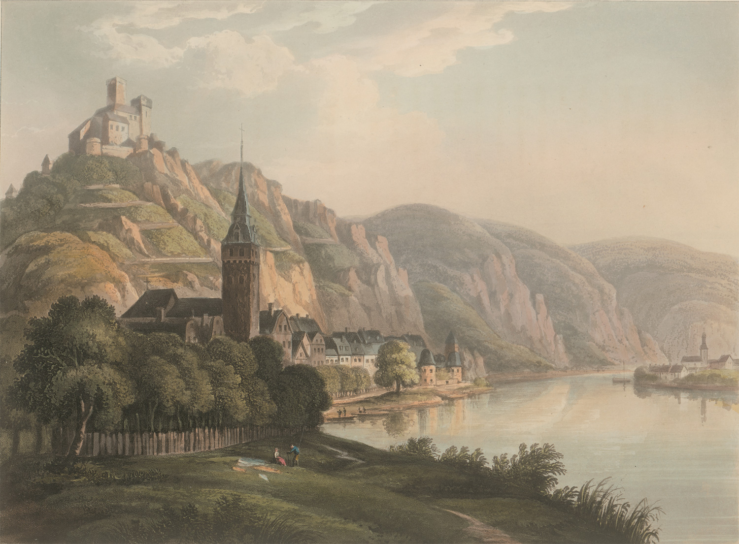 Die prachtvollen Aquatintaradierungen in äußerst sorgfältigem Kolorit zeigen u. a.: Bacharach, Biebrich, Bingen, Boppard, Braubach, Drachenfels, Godesberg (mit dem üblichen Setzfehler "Bodesberg"), Hammerstein, Koblenz, Köln, Liebenstein, Mainz, Oberwesel, Rolandseck, Siebengebirge, St. Goar, Thurmberg, – Nur stellenweise minimal braunfleckig, kaum gebräunt. Ein bemerkenswert schönes Exemplar in zeitgenössischem Einband. Im Block sehr sauber, frisch und mit den Aquatinten in geradezu bezwingendem, höchst nuancierten Kolorit (unwesentlicher, meist nur blasser Schatten durch Abklatsch).