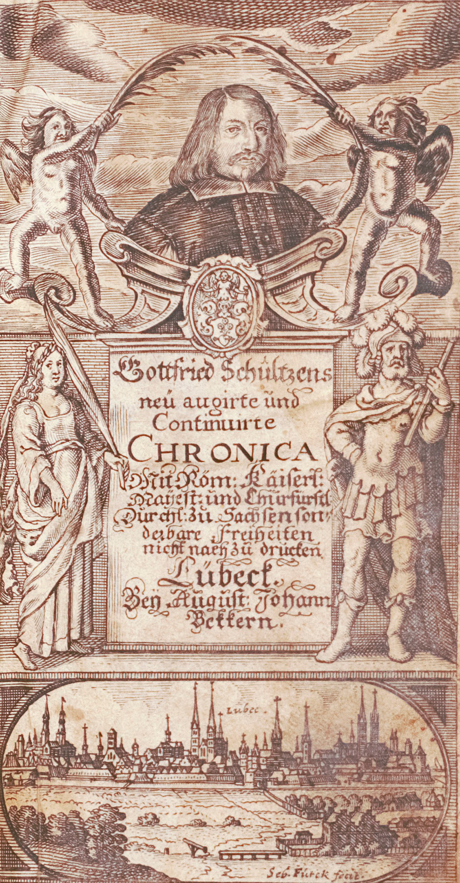 Schultze, Gottfried. Neu-augirte und continuirte Chronica. 8 Bl., 1001 S. (ohne das Schlussblatt mit dem Kolophon). Titel in Rot und Schwarz. Mit Kupfertitel. 15 x 8 cm. Blindgeprägter Schweinslederband d. Z. (stärker fleckig und berieben) mit 2 intakten Messingschließen (eine mit erneuertem Lederriemen). Lübeck, Jakob Hinderling für August Johann Becker, 1656.
