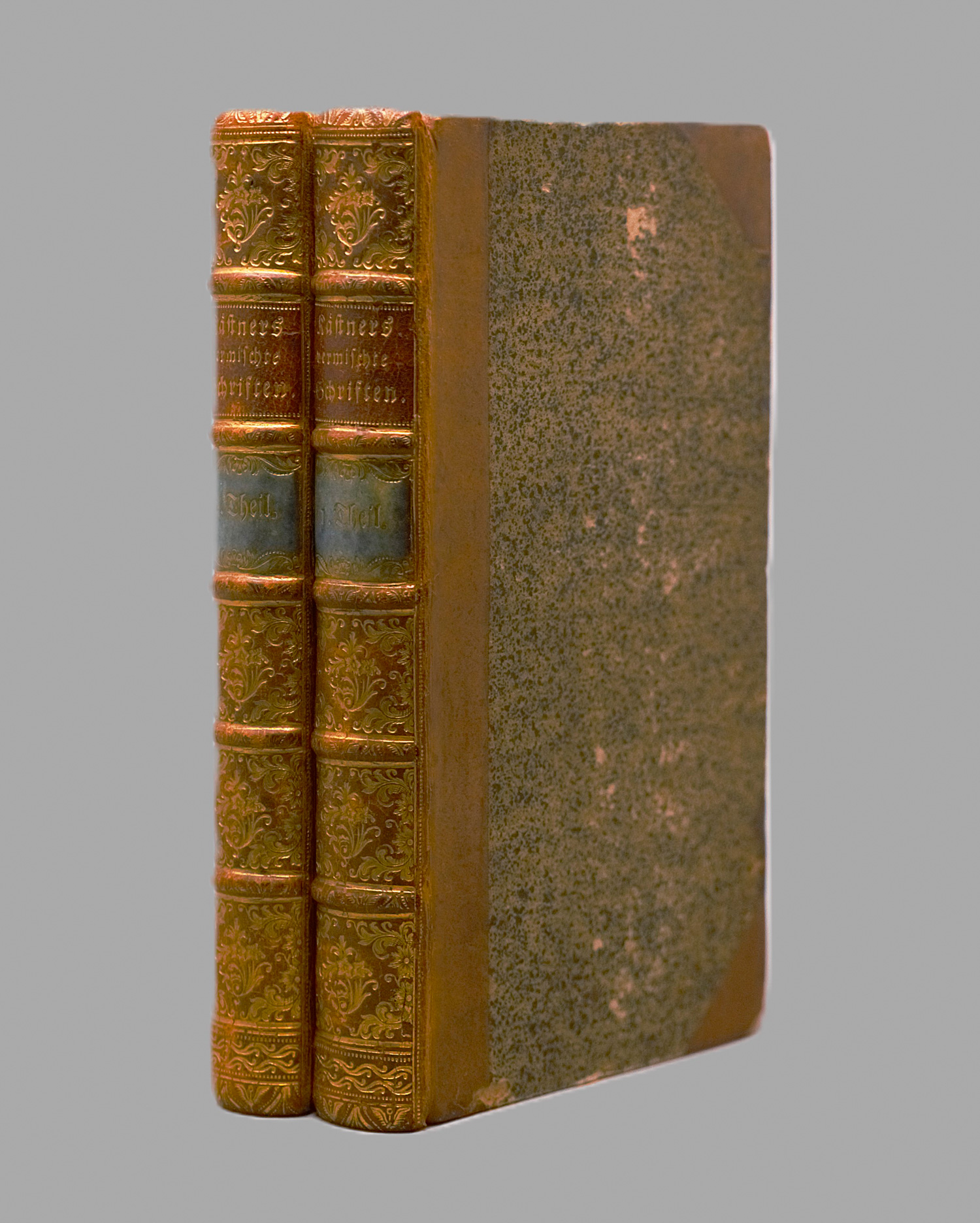 Goedeke IV/1, 42, 8, 1. – Mischauflage der ersten Buchveröffentlichung Kästners. Der Band I (1773) erschien bereits 1755 und liegt hier in zweiter Auflage vor, der Band II in erster Auflage (1772). Enthält verschiedene Abhandlungen, Lehrgedichte, Oden, Elegien, Fabeln, Sinngedichte, Parodien und lateinische Gedichte sowie Briefe. – Vorsätze etwas leimschattig, sonst nur gering braunfleckig. Mit Wappenstempel. Schönes und dekorativ gebundenes Exemplar mit prächtiger Rückenvergoldung aus dem Besitz des Göttinger Germanisten Richard Weissenfels (1857-1944), mit dessen Namensstempel.
