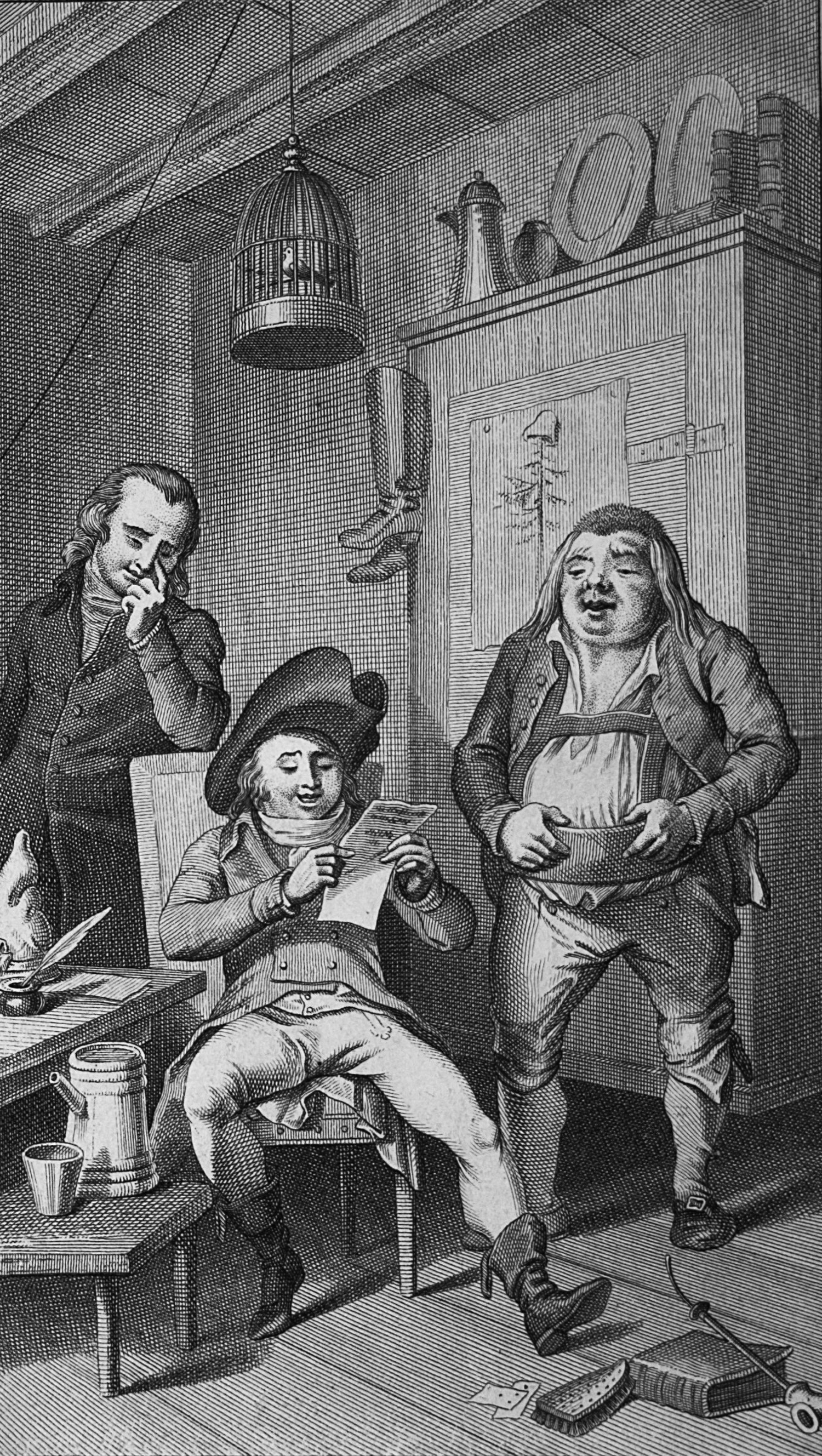 Goedeke IV/1, 204, 10. Lanckoronska-Oehler III, 69. – Erste illustrierte Ausgabe der Satire auf die Französische Revolution. Ratschky (1757-1810) verlegt die Handlung von Paris in das Dorf Schöpsenheim, u. a. mit parodierenden Bemerkungen zu Goethe und Wieland u. a. Das Freiheitslied (S. 225/226) ist in Rot und Blau auf weißem Grund gedruckt, um durch "diese liebliche Farbenmischung auf die Augen aller Freunde der Freyheit und Gleichheit einen sehr wohltätigen Eindruck [zu] machen" (S. 205). Die reizvollen Kupfer "gehören mit ihren drastischen Szenen, ihrer trefflichen Hogarth-artigen Charakterisierung und ihrem niederdeutschen Humor zu Rambergs Meisterleistungen" (Lanckoronska-Oehler). – Es fehlt das Kupfer zum dritten Gesang. Etwas stärker fleckig.