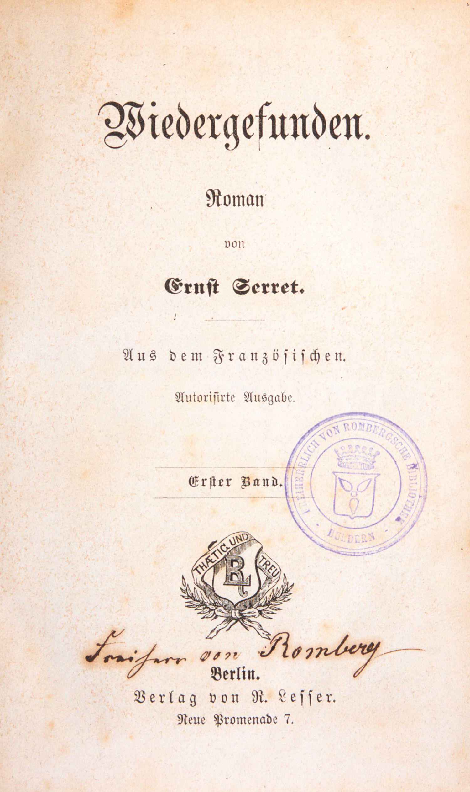 Serret, Ernst. Wiedergefunden. Roman. Aus dem Französischen. Autorisierte Ausgabe. 2 Teile in 1 Band. 1 Bl., 120 S.; 1 Bl., 100 S. 17,5 x 11 cm. Marmorierter Pappband d. Z. (berieben und bestoßen, mit hs. RSchild). Berlin, R. Lesser, (1867).
