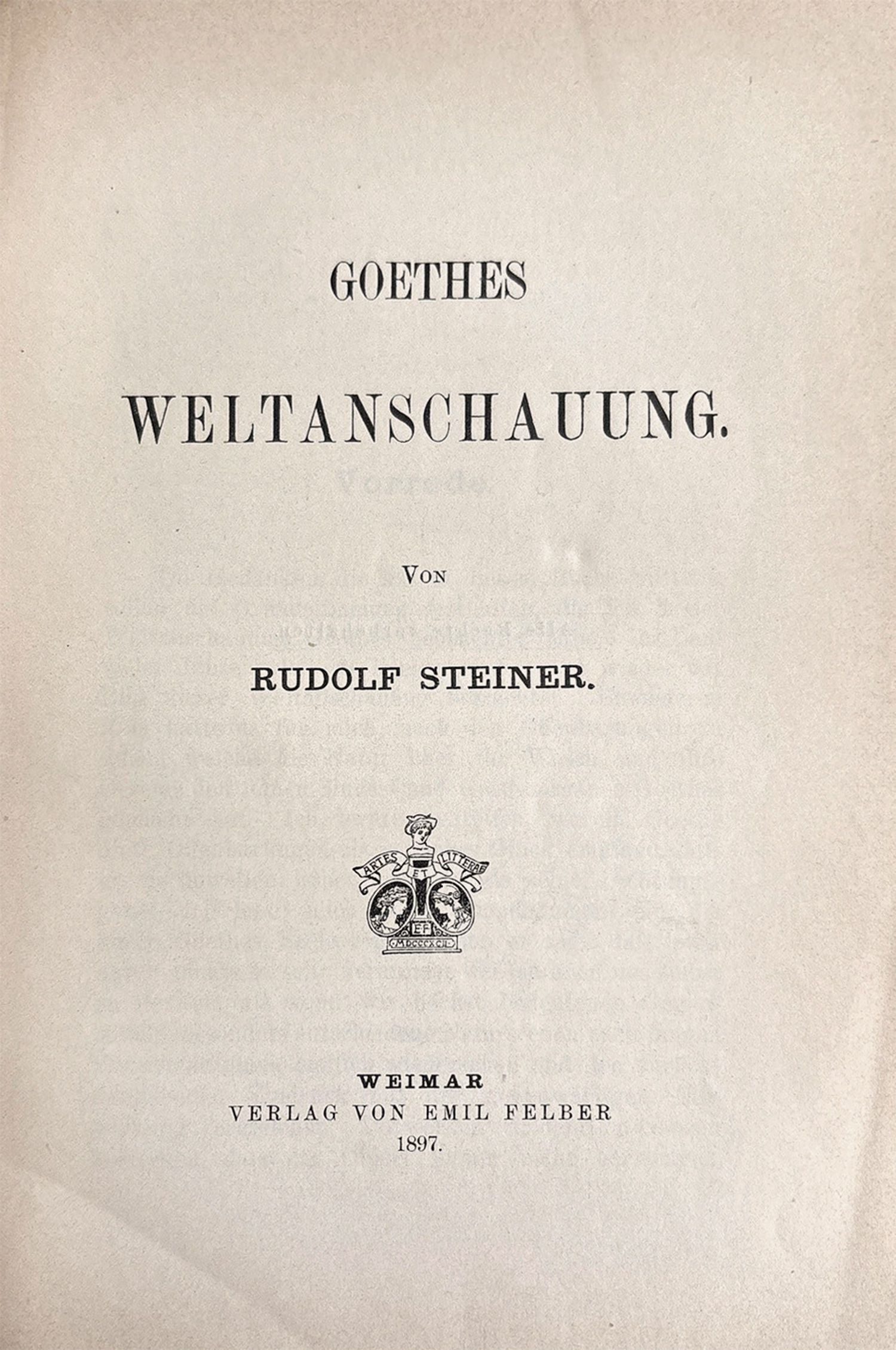 Die Schrift Goethes Weltanschauung schließt an seine anthroposophische Erkenntnistheorie an, die er in der Auseinandersetzung mit Goethes naturwissenschaftlichen Schriften während seiner Mitarbeit an der Sophienausgabe erlangte. "Seine Interpretation der naturwissenschaftlichen Schriften Goethes geht aus von einem Glauben an die überragende Bedeutung der Intuition für Erkenntnis und Bildung der Weltanschauung. Dieser Glaube wird für ihn das Band zur theosophischen Bewegung, über die er bald hinauswächst zur Entwicklung seiner 'Anthroposophie', einer Geheimlehre, die den Anspruch erhebt, eine Erkenntnis höherer Welten zu eröffnen, zugleich aber auch durch vertiefte Einsicht das gesellschaftliche Leben in Staat und Wirtschaft zu gestalten" (Ziegenfuß). – Wohlerhalten. Das Rückenschild ("Steiner I") lässt den Schluss zu, dass Rosa Mayreder wahrscheinlich zahlreiche Erstdrucke ihres Freundes Steiner besaß und sich diese vermutlich in den 1930er Jahren zu einer "Werkausgabe" binden ließ.