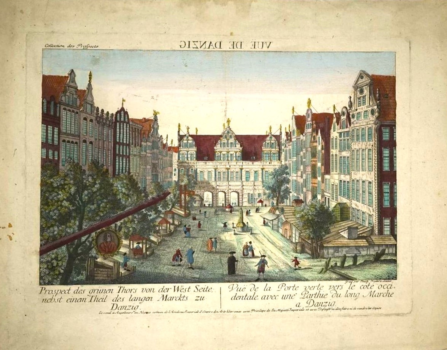 Sehr farbenfrohe Guckkastenblätter von Balthasar Friedrich Leizel (1750-1800) mit französischer und deutscher Beschriftung. Vorhanden sind: I. Vue de Mottlau. - II. Vue de la place ou marché de Danzig. - III. Vue de Danzig. – Leicht fleckig, vereinzelt mit kleinem Einriss (Darstellung nicht betroffen). Mit besonders hübschen und kräftigem Kolorit. Selten im Handel.