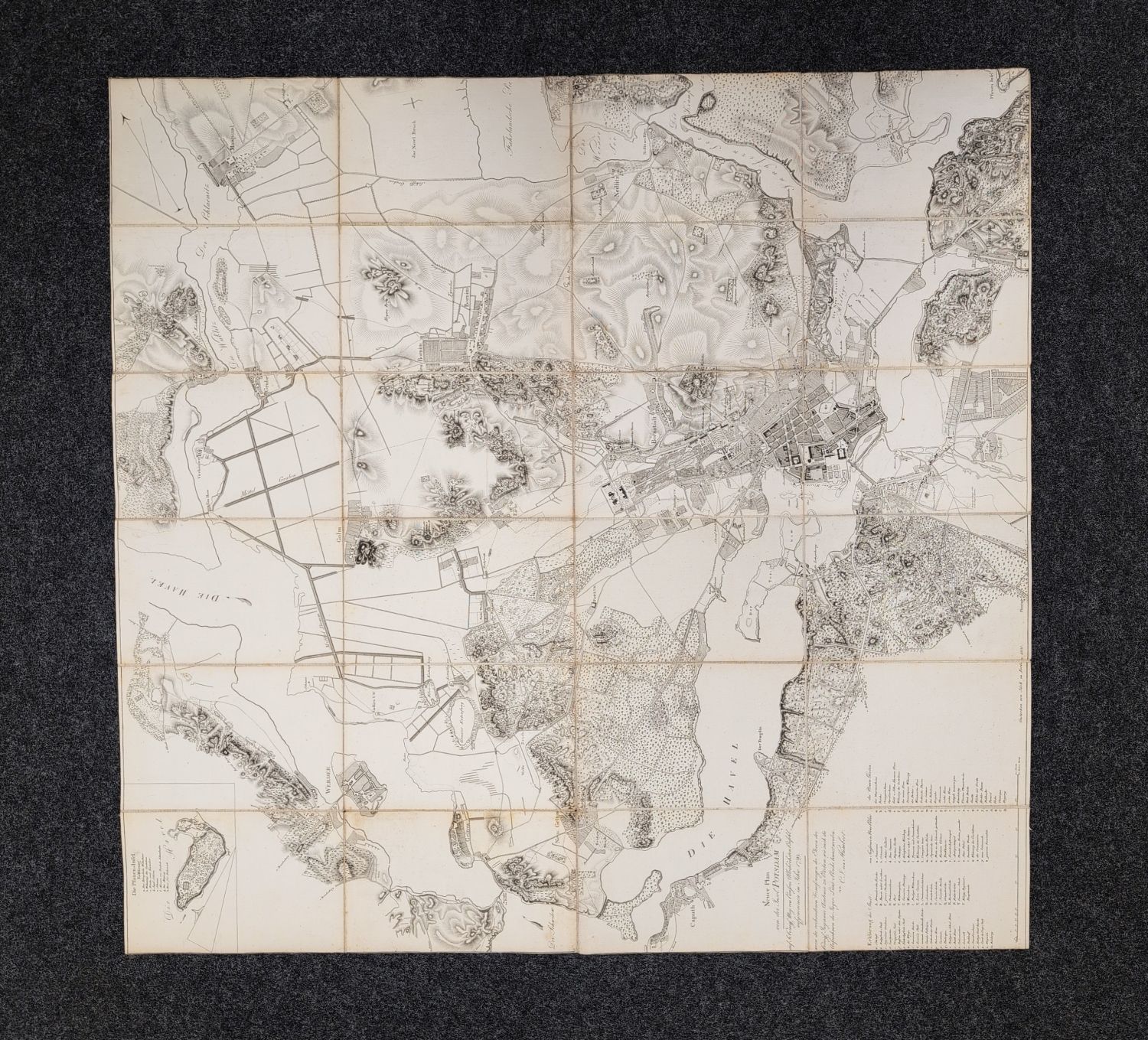Die Karte wurde "auf seiner königl. Maj. von Preussen allerhöchsten Befehl aufgenommen im Jahre 1799, wozu die vorhandenen Vermessungen der Eleven der königl. Ingenieur Academie zu Potsdam wie auch die Aufnahmen des Ingen. Lieut. v. Reiche benuzt worden". In der linken unteren Ecke mit umfassender Legende zur Stadt Postdam, zu Sanssouci, zum Neuen Palais und zum Neuen Garten. Rechts oben mit einer Insetkarte der Pfaueninsel. – Knapp beschnitten. Vereinzelt etwas stockfleckig, Leinen mit kleinen Einrissen (Darstellung nicht betroffen). Dekorativ.