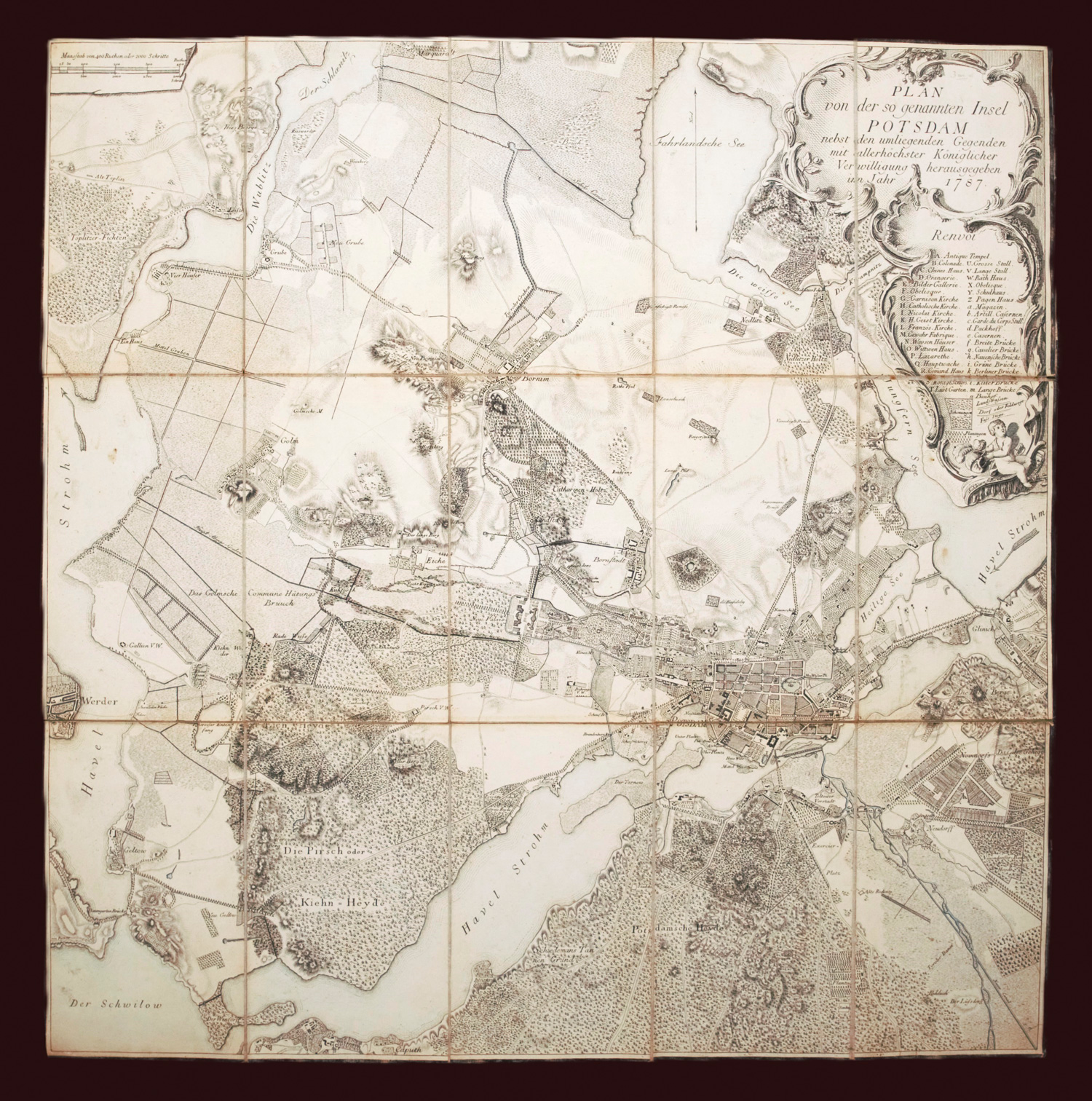 Schleuen, Johann David. Plan von der so genannten Insel Potsdam nebst den umliegenden Gegenden. Kupferkarte in 15 Segmenten auf Leinen aufgezogen. 64 x 63 cm (Blatt). Im modernen Pappschuber. Berlin, Schropp & Co., 1787.