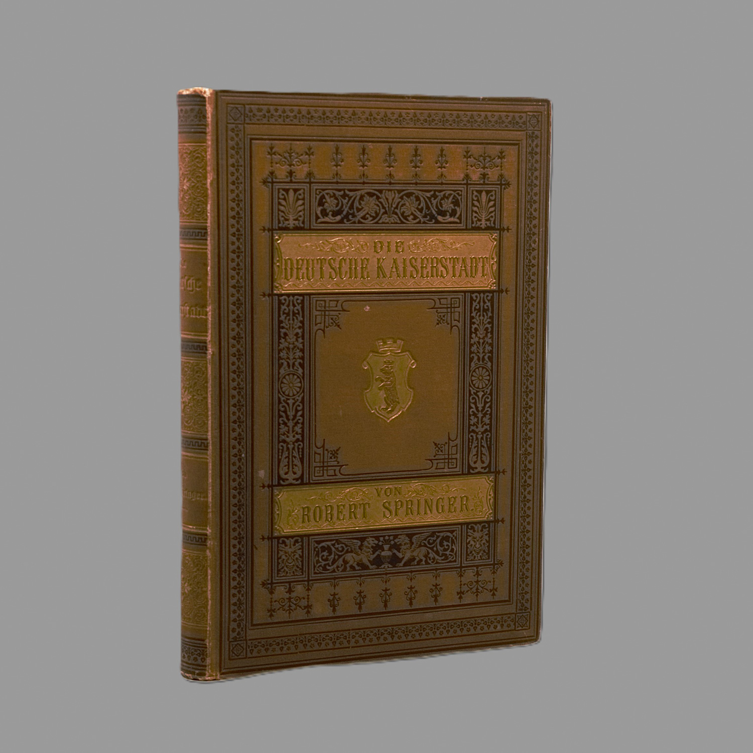Springer, Robert. Berlin. Die deutsche Kaiserstadt nebst Potsdam und Charlottenburg mit ihren schönsten Bauwerken und hervorragendsten Monumenten. Eine malerische Wanderung in Buch und Bild für Einheimische und Fremde. Zweite Auflage. 4 Bl., 247 S. Mit gestochenem Titel mit Vignette und 47 Stahlstichansichten. 25,5 x 16,5 cm. OLeinen (etwas berieben und bestoßen) mit Schwarz- und Goldprägung. Frankfurt, H. Bokelmann, 1883.