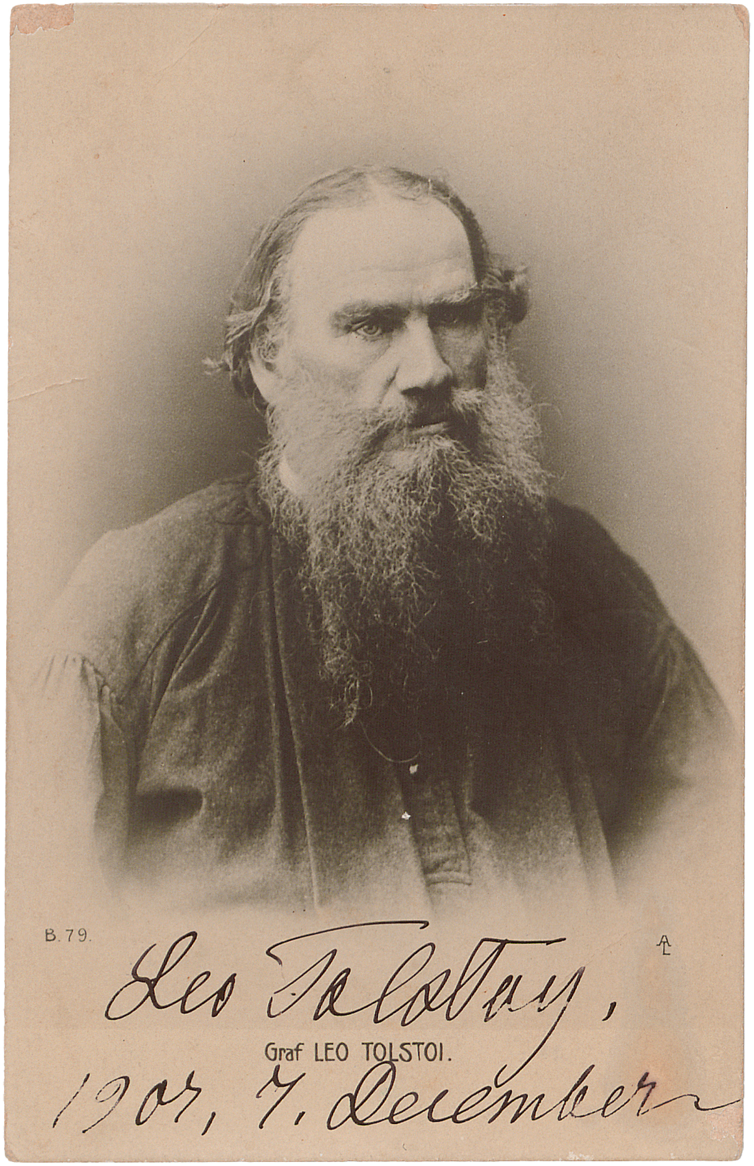 Tolstoi, Leo N. Graf, russ. Schriftsteller (1828-1910). Porträtfoto-Postkarte mit eigh. Signatur "Leo Tolstoy" und eigh. Datum auf der Bildseite. Orig.--Bromsilber-Abzug. O. O. 7.XII.1907.