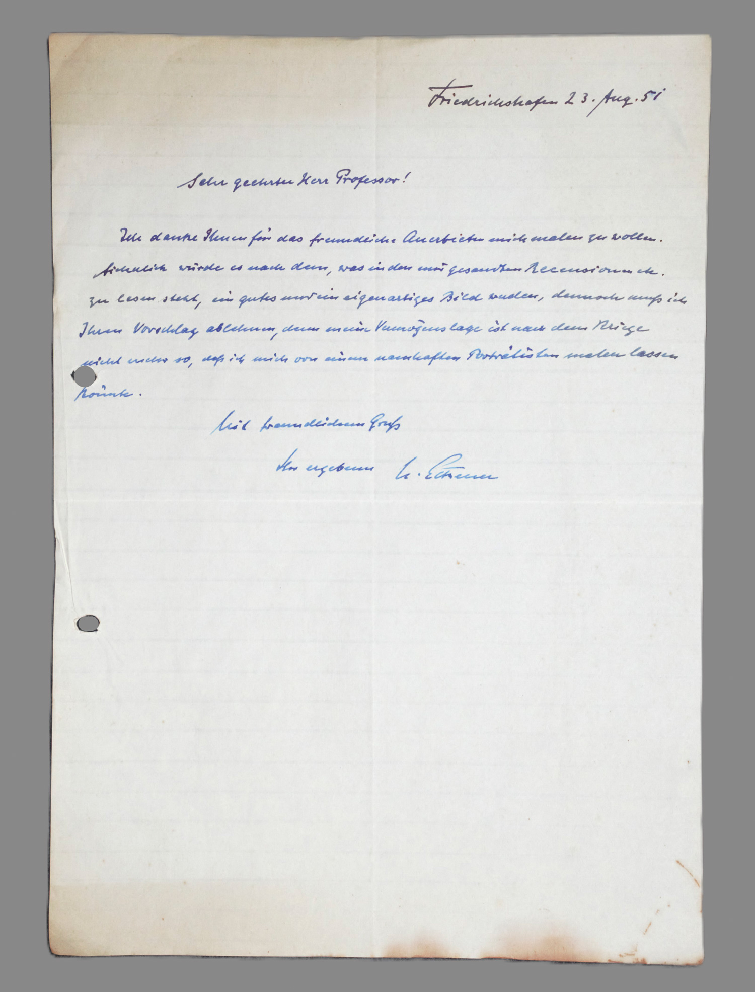 An einen Maler und Graphiker mit Professorentitel, der ihn porträtieren wollte. "... Ich danke Ihnen für das freundliche Anerbieten mich malen zu wollen. Sicherlich würde es nach dem, was in den mir gesandten Recensionen etc. zu lesen steht, ein gutes und ein eigenartiges Bild werden, dennoch muß ich Ihren Vorschlag ablhnen, denn meine Vermögenslage ist nach dem Kriege nicht wieder so, daß ich mich von einem namhaften Porträtisten malen lassen könnte ...". - Gelocht; leicht fleckig an den Rändern. - Dabei: Masch. Schreiben von Eckeners Sekretär (unterzeichnet [Otto] "Brausewetter") an denselben Maler, wegen eines gewünschten Kontaktes zu Eckener. 1/2 S. Mit gedrucktem Briefkopf "Dr. Dr. e. h. Hugo Eckener. Luftschiffbau Zeppelin G.m.b.H.". Friedrichshafen 20.III.1929. - Gleichfalls gelocht und mit kleinen Randläsuren.
