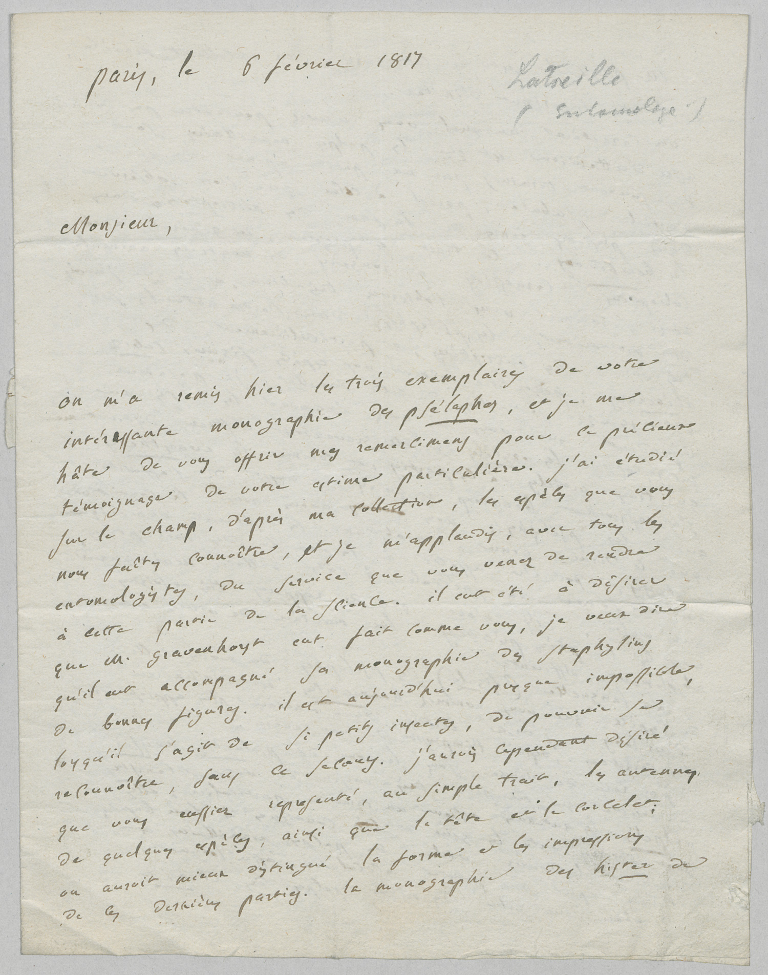 Latreille, Pierre André, franz. Zoologie, berühmter Entomologe (1762-1833). Eigh. Brief m. U. "Latreille". In franz. Sprache. 3 S., eng beschrieben. Doppelblatt mit Adresse und Siegelrest. 4to. Paris 6.II.1817.