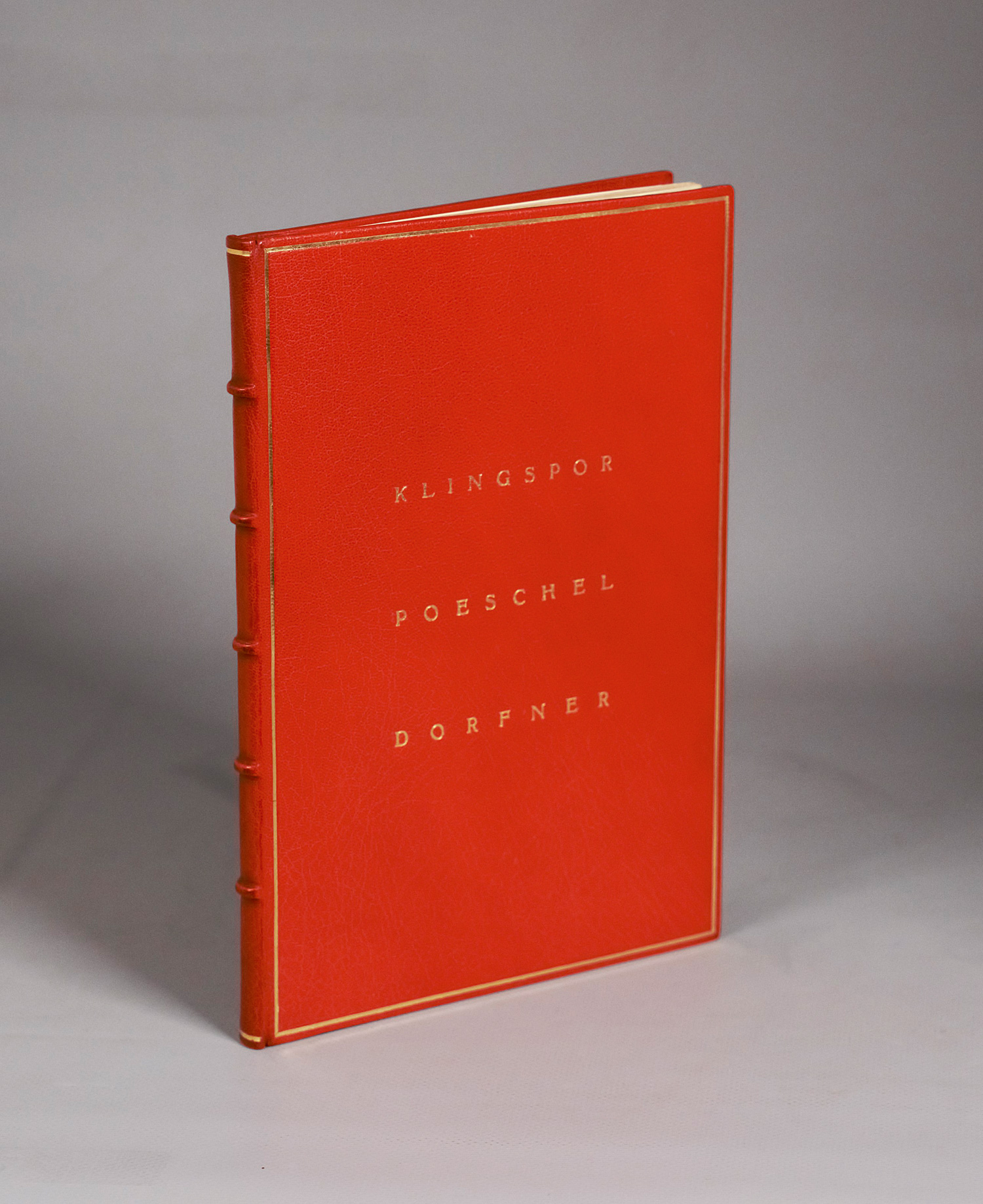 Dorfner, Otto. - Unsere Gutenbergringträger Klingspor Poeschel Dorfner. Drei Vorträge über ihr Werk. 40 S. 23,5 x 16 cm. Orangebrauner Maroquinband (signiert: "O.Dorfner - Weimar") mit Deckelfilete, goldgeprägtem Deckeltitel, Innenkantenfilete und KGoldschnitt mit Schutzumschlag in Pappschuber. O. O., Dr. u. J. (1941).