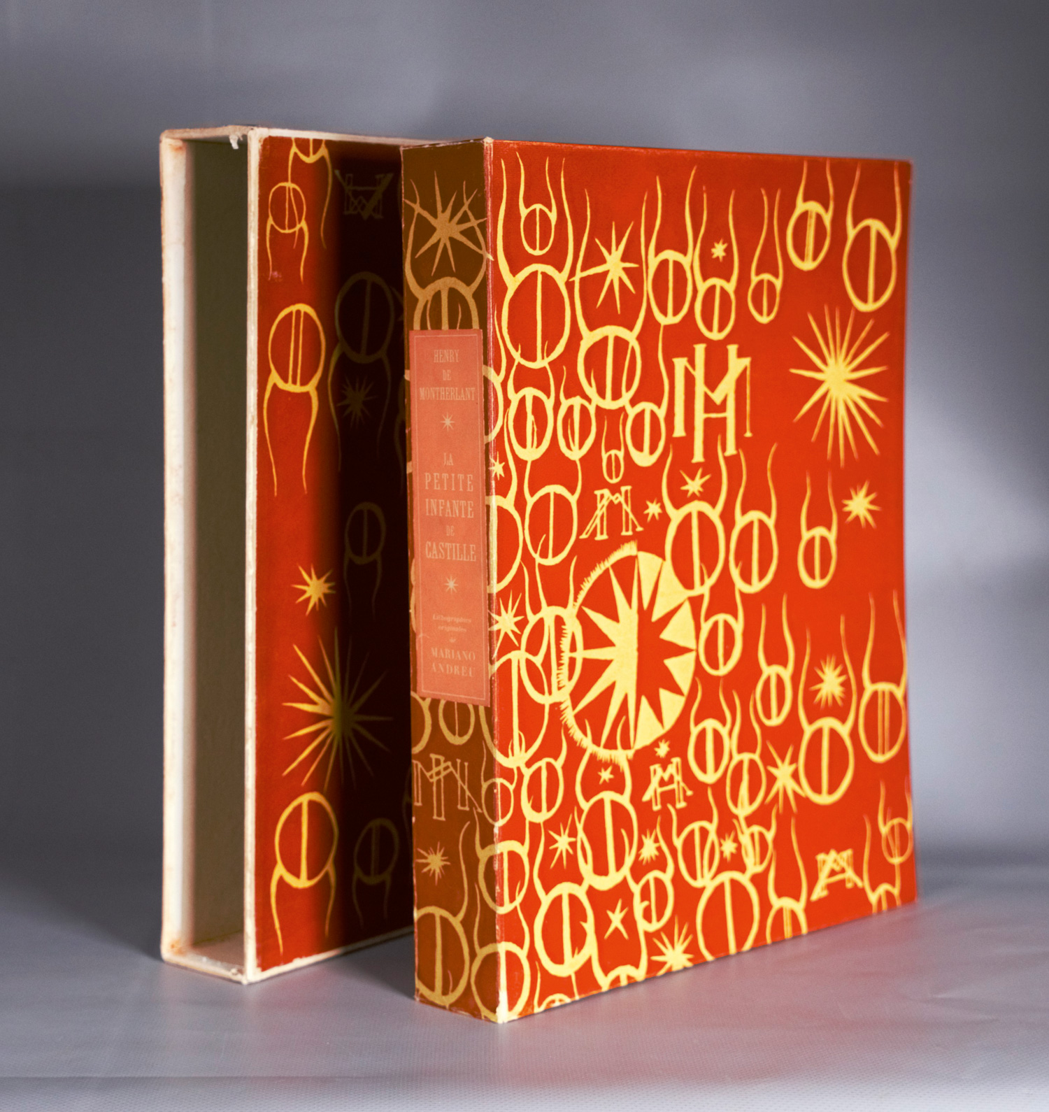 Montherlant, Henry de. La petite infante de Castille. Historiette. 183 S., 1 Bl. Mit 22 Originallithographien von Mariano Andreu. 33 x 25 cm. Lose Bogen in OOUmschlag, illustr. OPappdecke und illustr. OPappschuber. Paris, H. Lefèbvre, 1947.