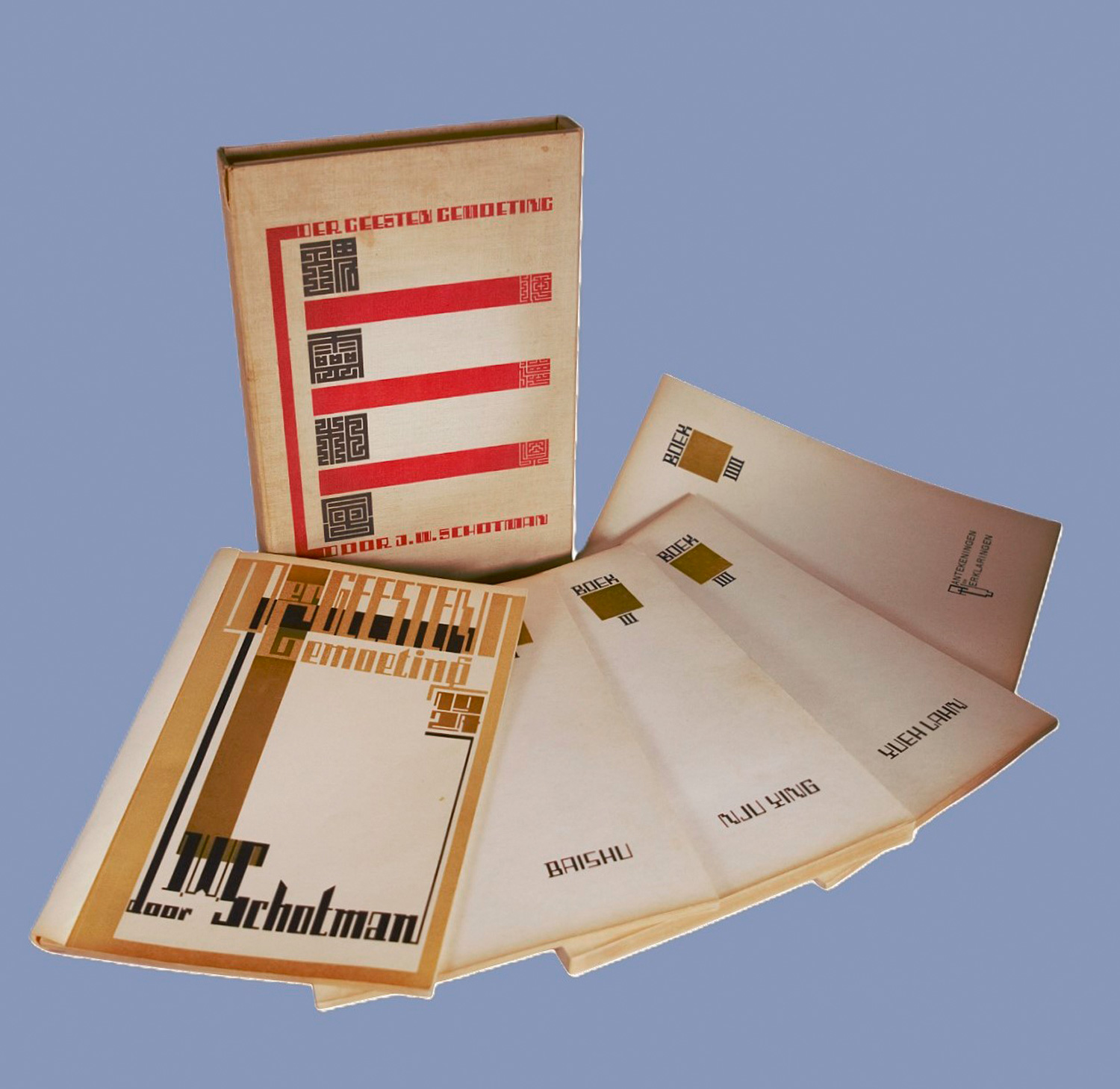 Schotman, Johan Wilhelm. Der Geesten gemoeting. Vier morgenlandse dromen in verzen. 4 Bände. Mit goldgeprägtem Illustrationen und mehreren farbigen, montierten Abbildungen von Moh Shih Chen. 27 x 16,5 cm. OBroschur (leicht gebräunt und feckig) in illustrierte OLeinenkassette (gebräunt, berieben, leicht fleckig und mit kleinen Einrissen an den Gelenken). Amsterdam, Van Holkema & Warendorf, (1927).