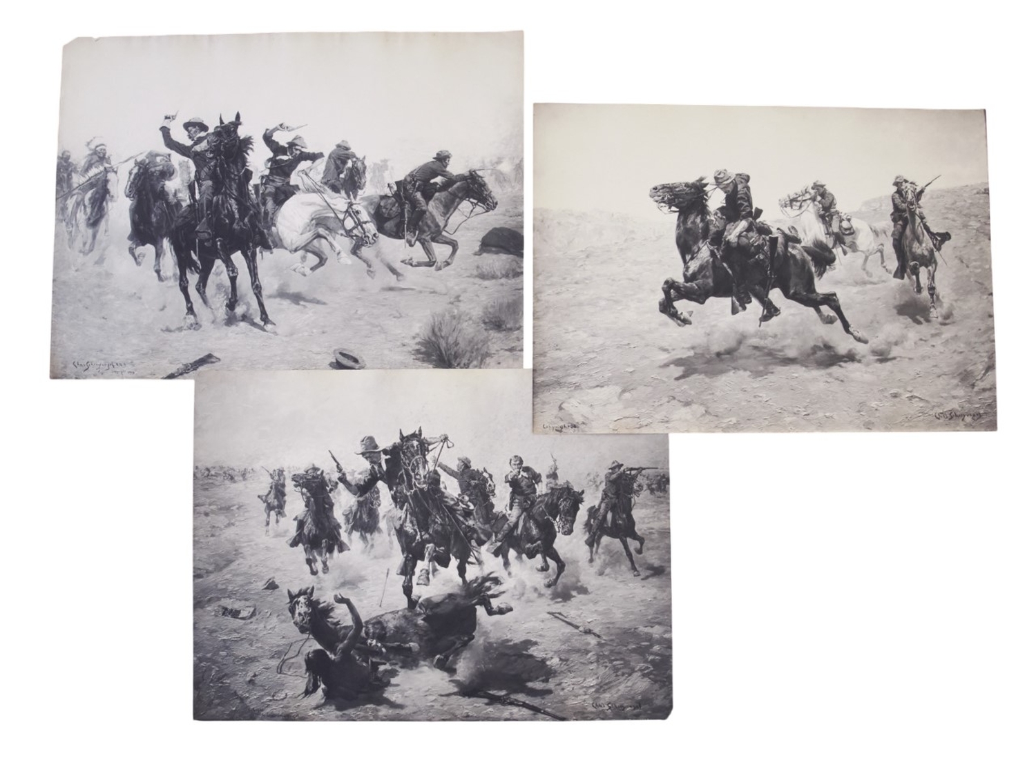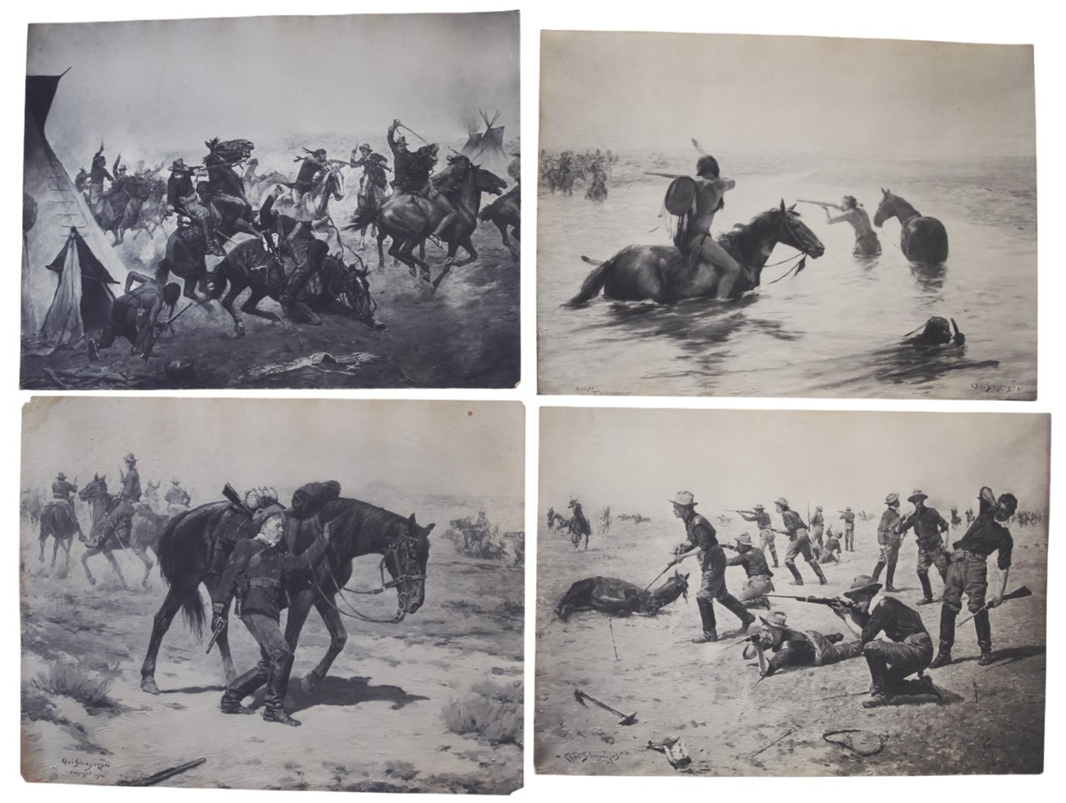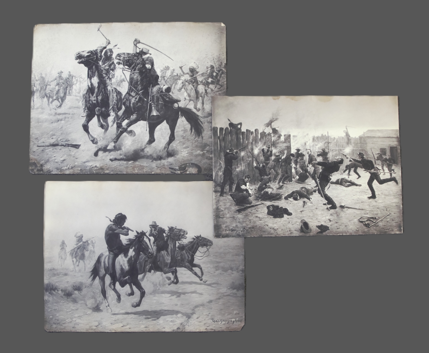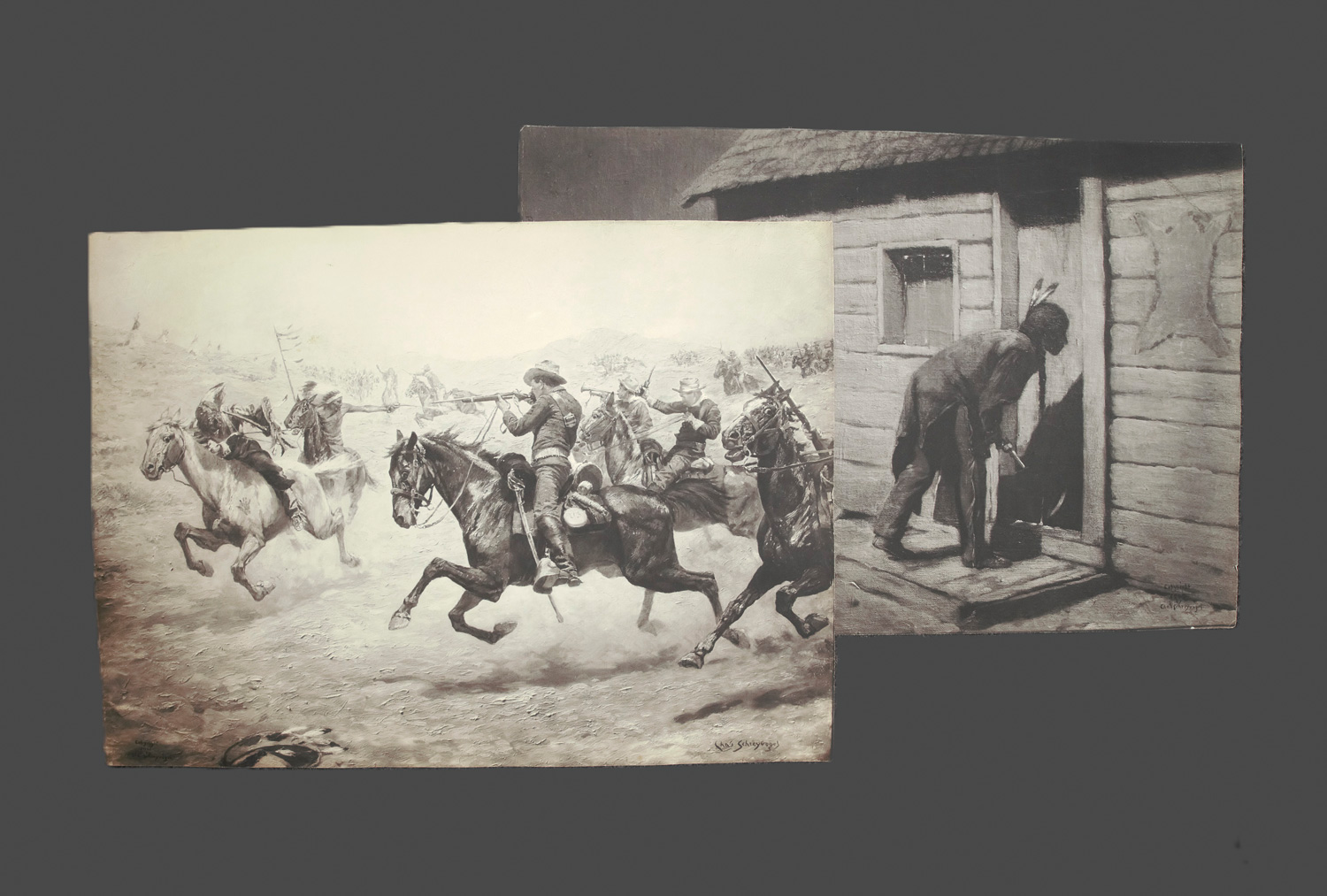 Schreyvogel, Charles. Konvolut von 15 Schwarz-Weiß-Reproduktionen von Gemälden, jeweils mit blindgeprägtem Copyright-Stempel. 34,5 x 51 cm. Lose Blatt. O. O. (um 1920).