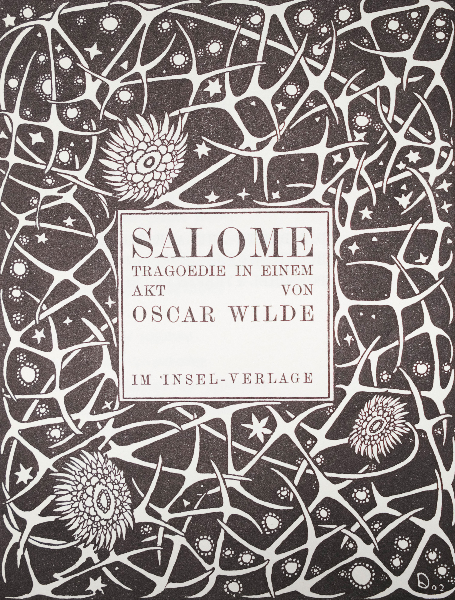 Wilde, Oscar. Salome. Tragödie in einem Akt. Übertragung von Hedwig Lachmann. Dritte Auflage. 76 S., 1 Bl. Mit illustriertem Doppeltitel und 2 Textillustrationen auf Tafeln von Marcus Behmer. 18,5 x 13,5 cm. Schwarze illustrierte OBroschur (VUmschlag zur Hälfte gelöst). Leipzig, Insel, 1906.