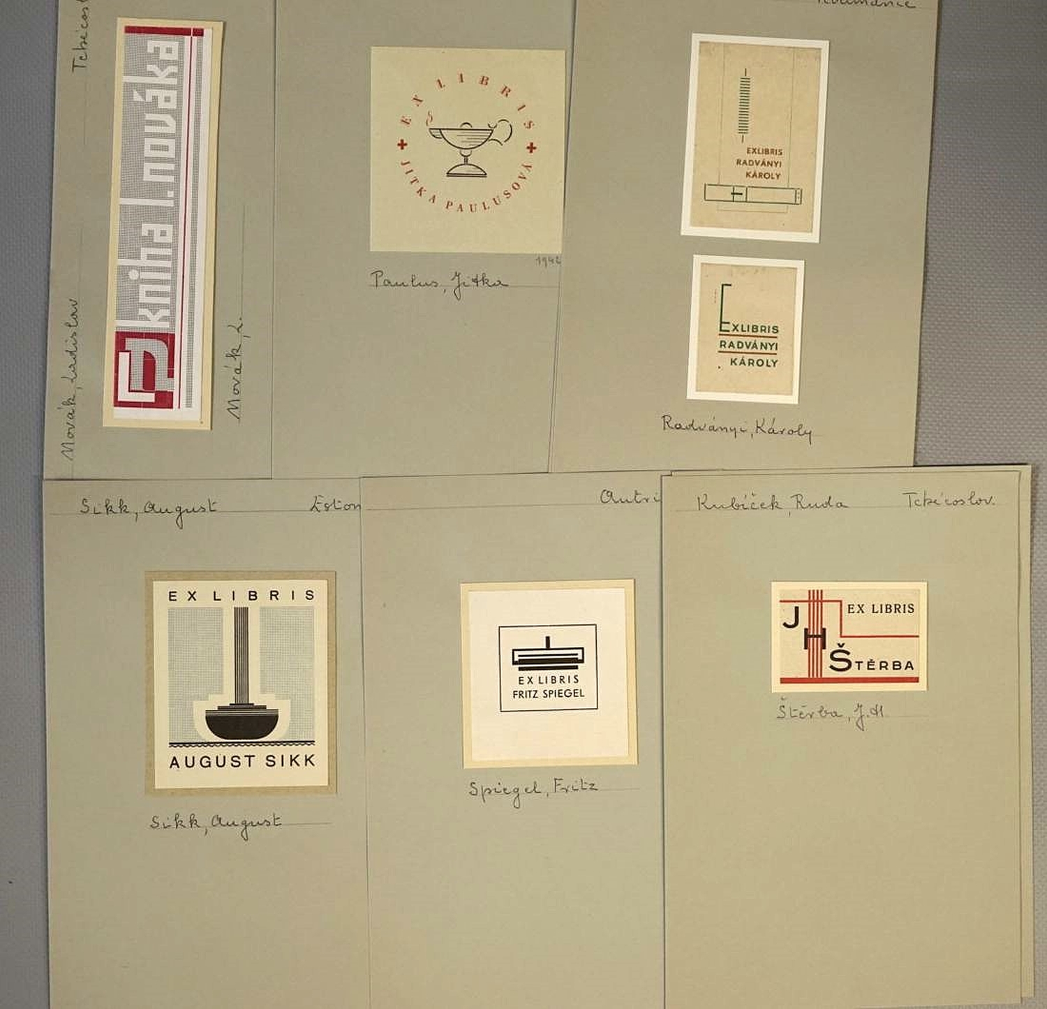 Zahlreiche Exlibris aus dem späten 19 bis in das frühe 20. Jahrhundert und in Original-Graphik, teils im Bauhausstil aus Deutschland und der Tschechoslovakei. Unter den Motiven Landschaften, Bücher, Blumen, Tiere, Erotika, Asiatika, Wappen, etc. – Vereinzelt mit Gebrauchsspuren. Wohlerhalten. Beiliegend ein Schuber mit ca. 150 Fotokopien verschiedener Exlibris.