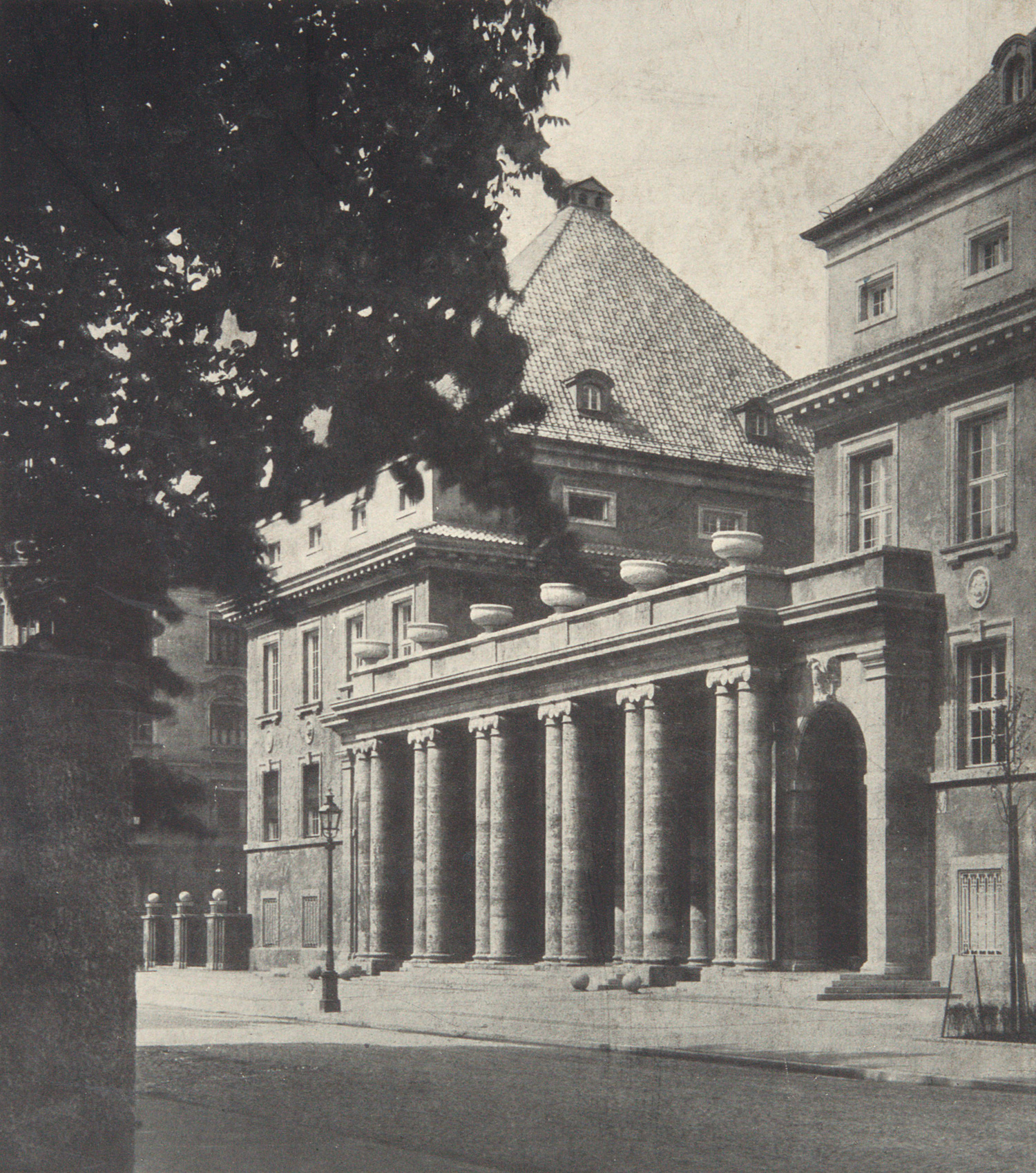 Ostini, Fritz von. Münchener Rückversicherungs-Gesellschaft. Erbaut von den Architekten Osw. Ed. Bieber und Wilh. Hollweck. 1 Bl., 46 S. Mit zahlreichen Text-Abbildungen. 32,5 x 24 cm. OPappband (leicht stockfleckig und bestoßen) mit goldgeprägtem DTitel und montiertem Foto-Abbildung auf dem VDeckel. Darmstadt, Verlags-Anstalt Alexander Koch, o.J. (1914).