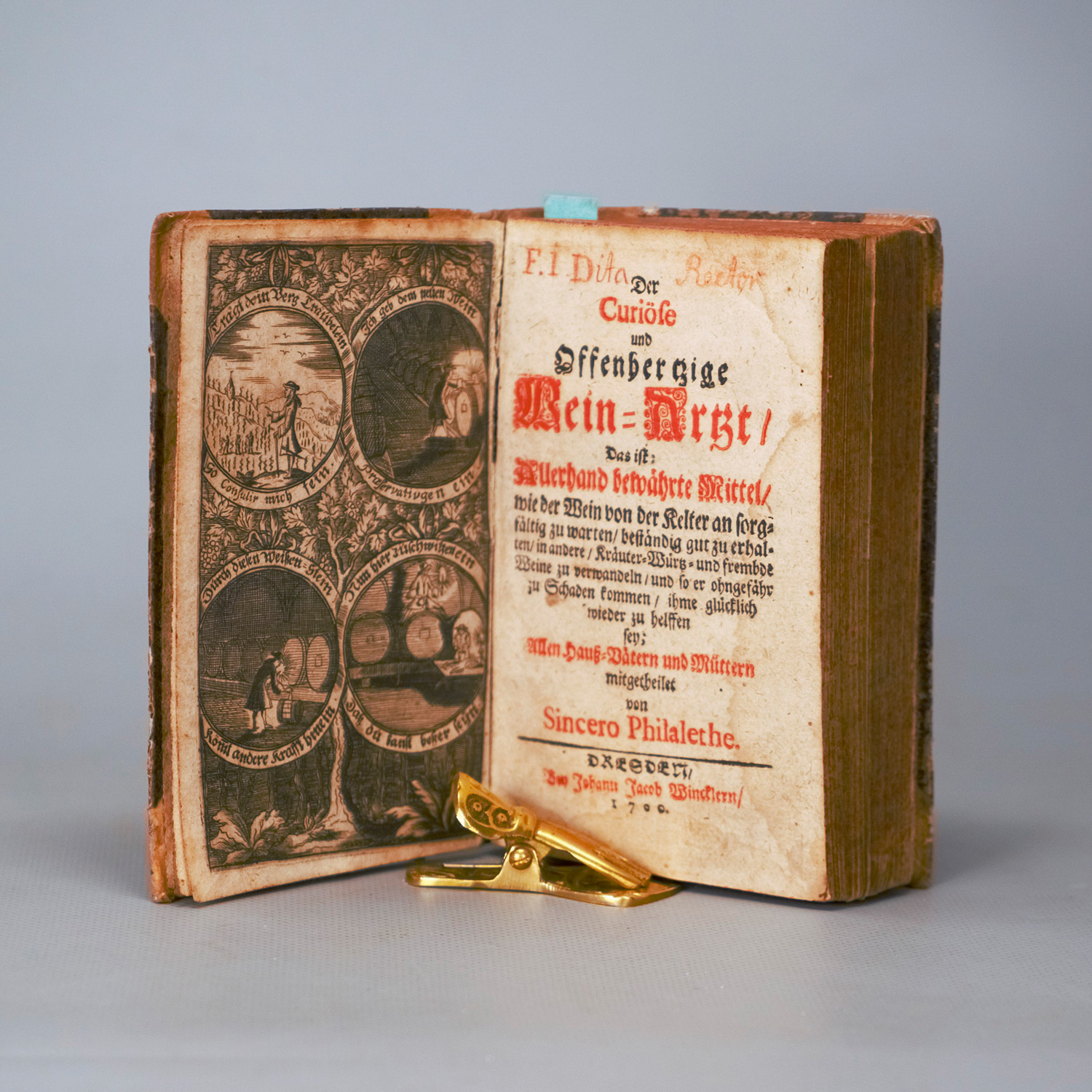 (Knohll, Johann Paul). Der curiöse und offenhertzige Wein-Artzt, das ist: Allerhand bewährte Mittel, wie der Wein von der Kelter an sorgfältig zu warten, beständig gut zu erhalten sey. Allen Hauß-Vätern und Müttern mitgetheilet von Sincero Philalethe (Pseud.). 3 Bl., 136 S., 1 Bl.; 237 S. Titel in Schwarz und Rot. Mit gestochenem Frontispiz. 15,5 x 9 cm. Halbpergament d. Z. (stärkere Gebrauchsspuren, Block verschoben). Dresden, Johann Jakob Winckler, 1700.