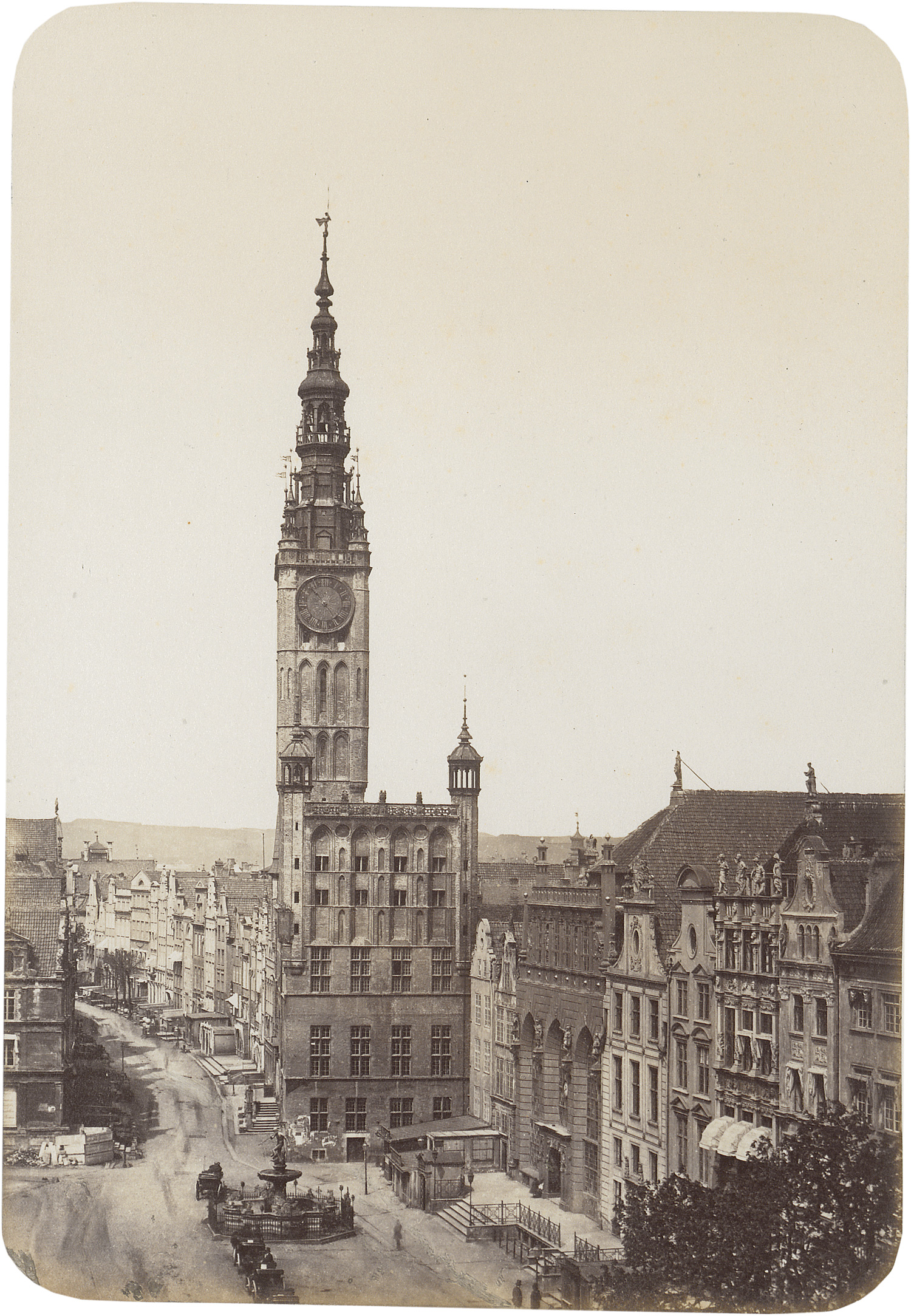 A striking visual record of late 19th-century Danzig (now Gdańsk), this group includes views of significant civic and architectural landmarks of the historic Hanseatic city. Depicted are the Artus Court (Artushof), the Golden Gate (Langgasser Tor), the Great Armory (Großes Zeughaus), the Green Gate (Grünes Tor), the Old City Hall, and the Marienkirche from various perspectives, including panoramic views of the historic center. Many views are animated with horse-drawn carriages and passersby, offering a glimpse of urban life in the Prussian-era city. The photographs, distinguished by sharp detail and balanced compositions, reflect Ballerstadt’s skill in capturing both architectural grandeur and atmospheric cityscapes. – Minimal foxing on the mounts; some light fading on a few prints. Otherwise, all prints with strong tones and in near excellent condition.