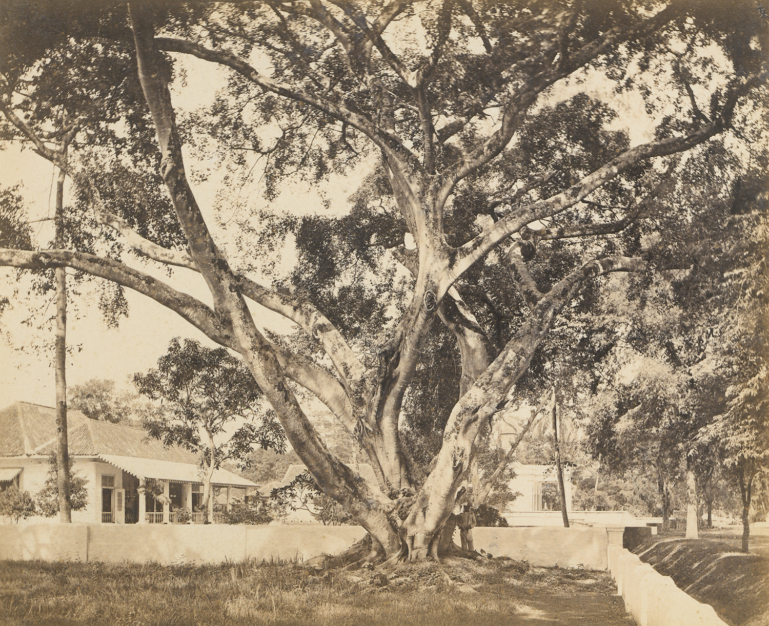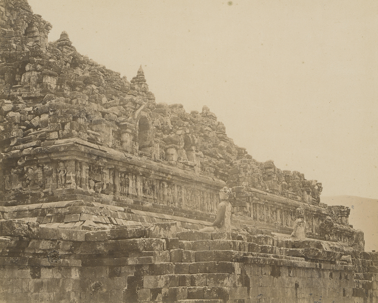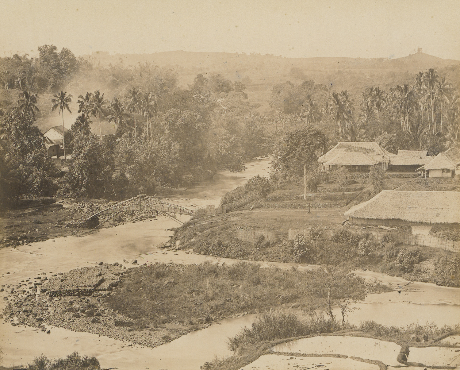 Photographer: Woodbury & Page (active 1857-1908). Views of Java. 1870s. 30 albumen prints, mounted to boards. Each ca. 19 x 24 cm or reverse (34,5 x 46 cm). With the photographer’s blind stamp embossed in lower right corner and handwritten captions in pencil below the images on the mount. Presented in canvas-backed clamshell box with silk-lined interior and richly hand-illustrated title leaf featuring Javanese script and a dedication to “Fürst Bismarck.”