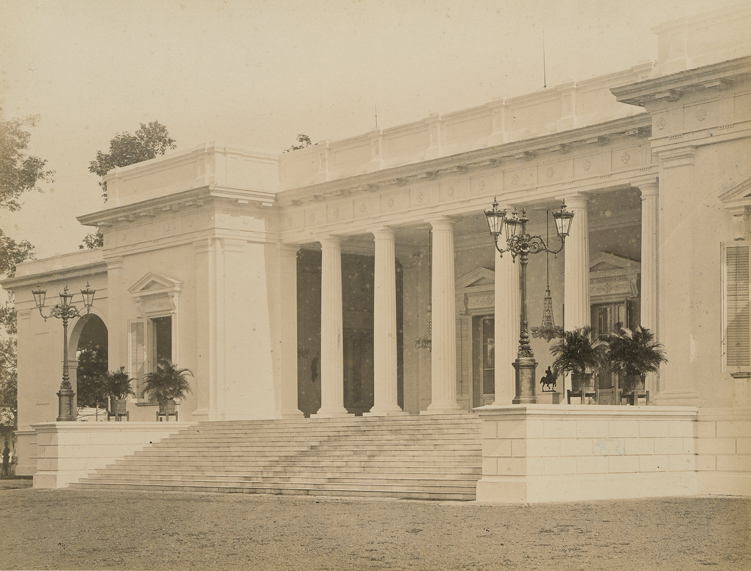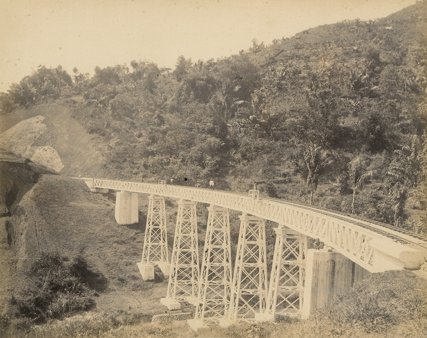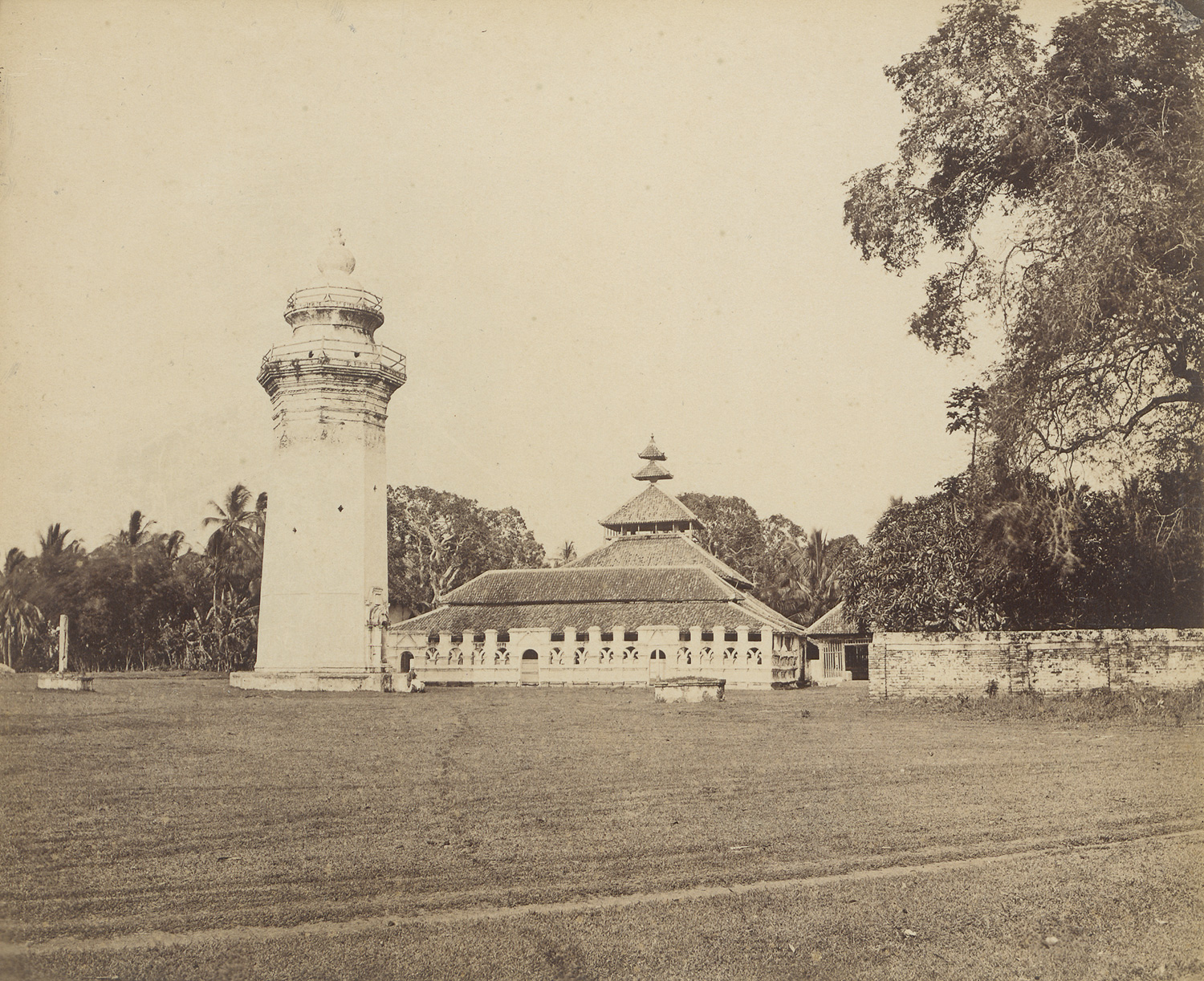 Photographer: Woodbury & Page (active 1857-1908). Views of Java. 1870s. 30 albumen prints, mounted to boards. Each ca. 19 x 24 cm or reverse (34,5 x 46 cm). With the photographer’s blind stamp embossed in lower right corner and handwritten captions in pencil below the images on the mount. Presented in canvas-backed clamshell box with silk-lined interior and richly hand-illustrated title leaf featuring Javanese script and a dedication to “Fürst Bismarck.”