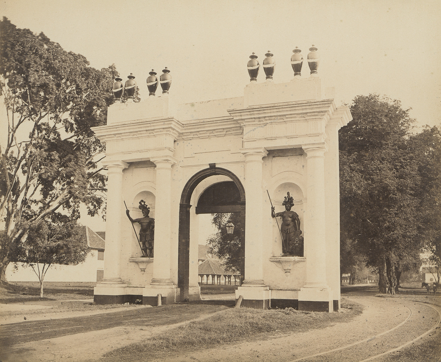 This rare and visually striking set offers a wide-ranging photographic survey of colonial Java in the 1870s, including Batavia (Jakarta), Buitenzorg (Bogor), Bandung, Garut, and surrounding volcanic landscapes. The images depict prominent civic buildings such as the former Stadhuis of Batavia, the military hospital, colonial residences, botanical gardens, bridges, markets, and staged ethnographic scenes. Figures in traditional dress appear throughout, offering glimpses of daily life in the Dutch East Indies. The group includes a richly hand-illustrated title page with gold embellishments and Wayang-style figures, bearing a dedication to “Fürst Bismarck” in Javanese script and Latin lettering-suggesting the set was conceived as a diplomatic or commemorative gift to the German Chancellor during a period of expanding international influence.