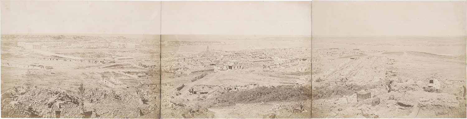 View of Sebastopol harbor from the Redan. 1855. Three-part salted paper print panorama, mounted to card. Each ca. 23 x 30 cm (entire size 38 x 102 cm). Signed “Robertson” in brown ink in the lower left corner of far-left print.
