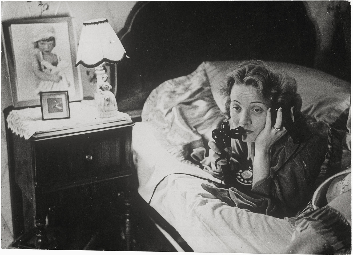 Marlene Dietrich on the telephone with her daughter in Berlin from Hollywood, 1930; Benito Mussolini, Heinrich Brüning, Dino Grandi, and Julius Curtius at the Hotel Excelsior, Rome, 1931. 2 gelatin silver prints, 1 ferrotyped and on Agfa-Brovira paper, printed 1960s. Each circa 18 x 24,5 cm. One with two agency stamps, photographer’s stamp, and annotated in pencil/marker on the verso; the other with typed press text and name stamp on the verso.