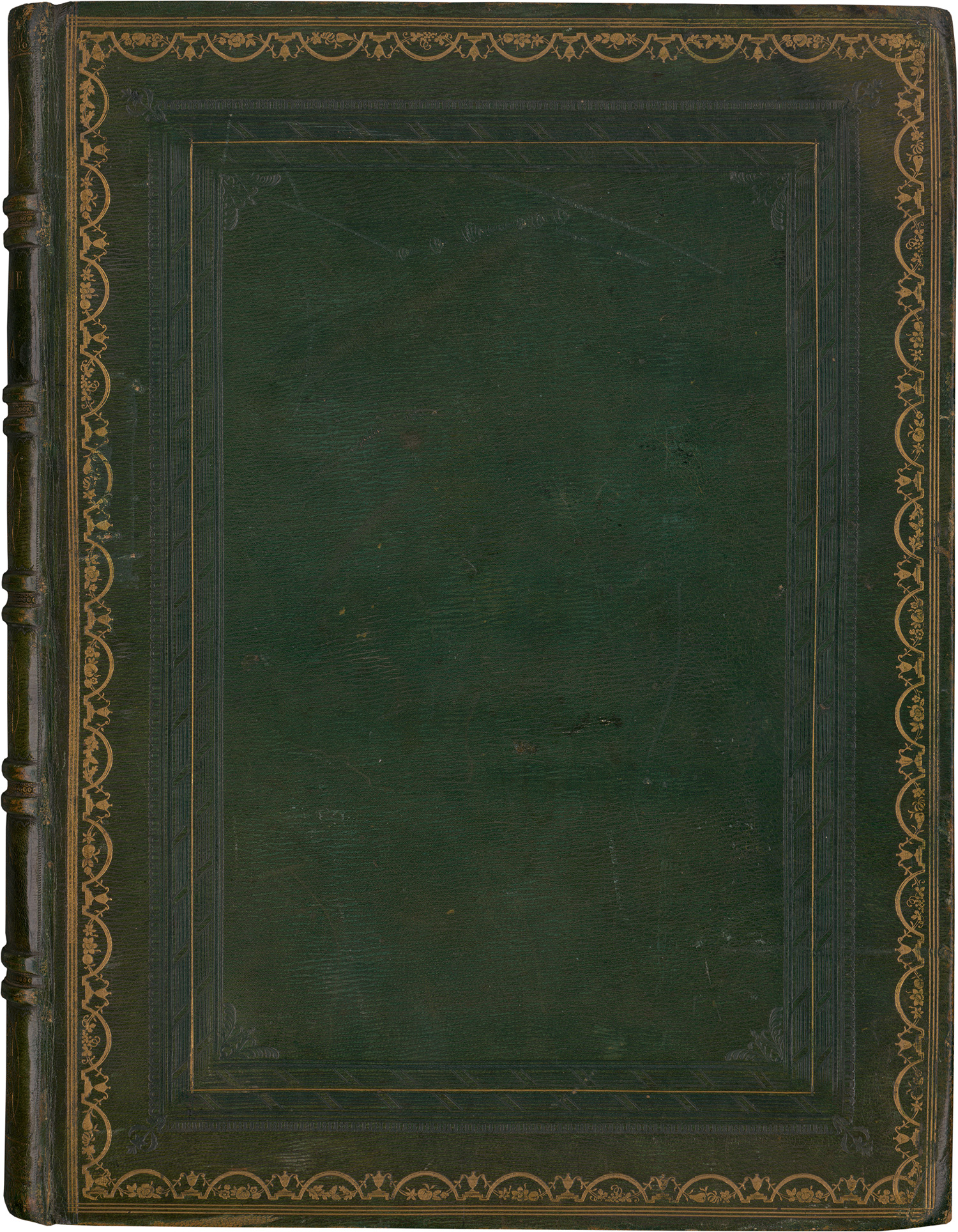 (Harding, Edward). Costume of the Russian Empire, illustrated by upwards of seventy richtly coloured engravings, dedicated ... to her Royal Highness the Princess Elizabeth. 6 nn. Bl., 72 Bl. (Tafelerklärungen in Englisch und Französisch). Mit koloriertem Kupfertitel und 72 handkolorierten Kupfertafeln in Punktiermanier und Sepia von J. Dadley. 34,5 x 26,5 cm. Olivgrünes quergenarbtes Chagrin d. Z. über 5 Doppelbünden mit goldgeprägtem RTitel, Punktierfileten und reicher RVergoldung, Deckel mit Gold- und Blindprägung, umlaufender goldgeprägter Floralbogen-Bordüre und Faszien-Blindprägung mit Eckfleurons, goldener Innenkantenfilete, Kleisterpapiervorsätzen und dreiseitigem Goldschnitt. London, Crown & Mitre, Pall Mall, für E. Harding (Tafeln) bzw. London, T. Bensley für John Stockdale et. al., 1811
