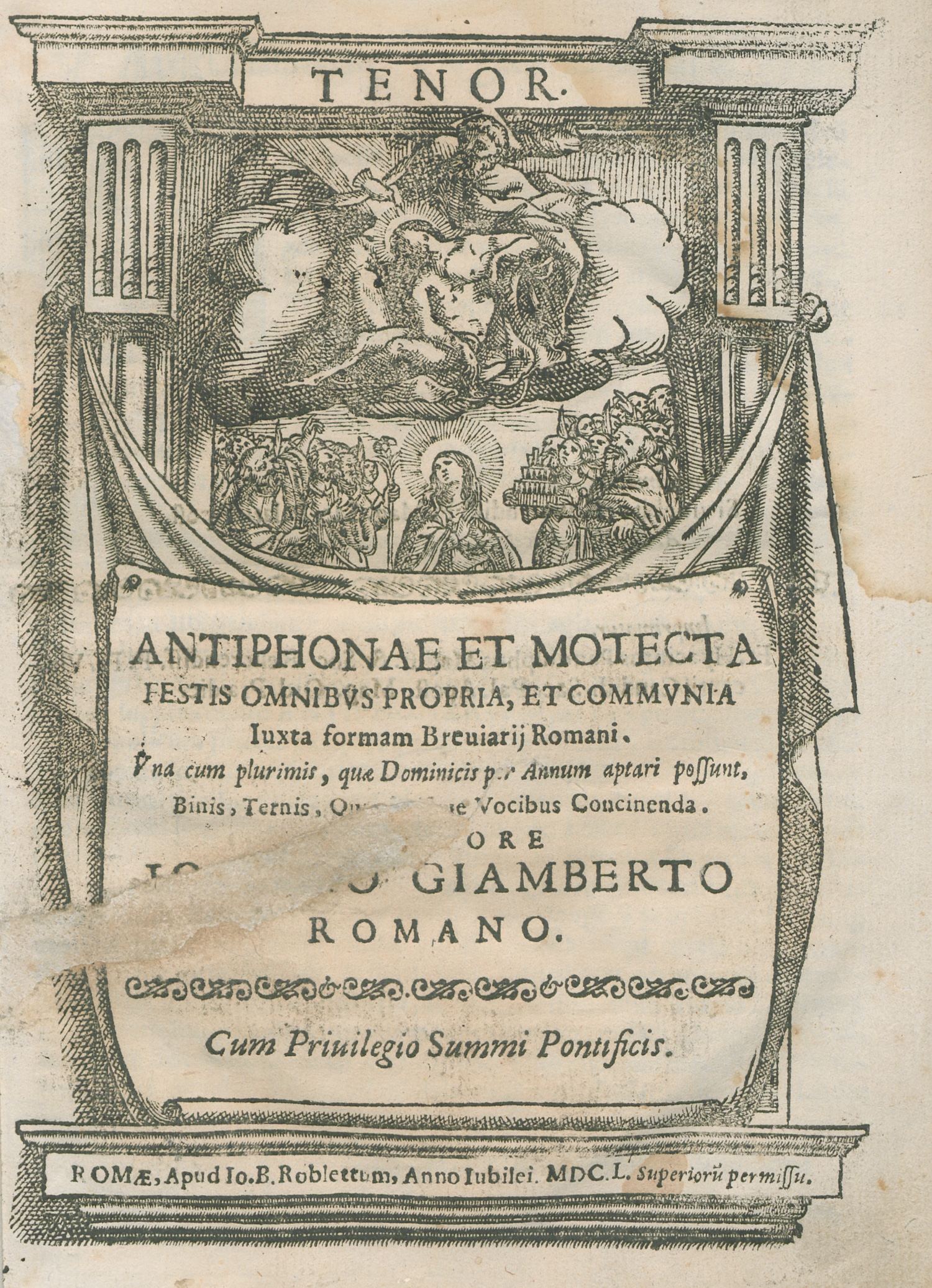 RISM A/I/3, G 1831. TNG VII, 347. Eitner IV, 234. Fétis III, 477. MGG V, 78. Nicht bei Hirsch und Wolffheim. – Erste Ausgabe. Vokalmusik (Antiphonen und Motetten) der römischen Schule aus der Mitte des 17. Jahrhunderts. Das bedeutendste Sammelwerk von Giamberti (um 1600-1663, u. a. Kapellmeister von Santa Maria Maggiore in Rom), dessen Kirchenmusik weiteste Verbreitung fand. Enthält über 200 geistliche Gesänge, komponiert für die Kirchen in Rom. "Sein hohes Ansehen drückt sich in der Tatsache aus, daß er berufen wurde, das römische Antiphonar herauszugeben" (MGG). Als Schüler von Giovanni Bernardino Nanino und Paolo Agostini vorzüglich im polyphonen Stil ausgebildet, war Giamberti sowohl dem Erbe Palestrinas verpflichtet wie auch offen für den neuen Stil des 17. Jahrhunderts. – Moderne Vorsätze. Teilweise gebräunt oder etwas braunfleckig, erste 2 Blatt mit Wasserrand. Titel mit hinterlegtem Ausriß (etwas Textverlust), das letzte Blatt mit kleinen hinterlegten Papierfehlern im weißen Rand.