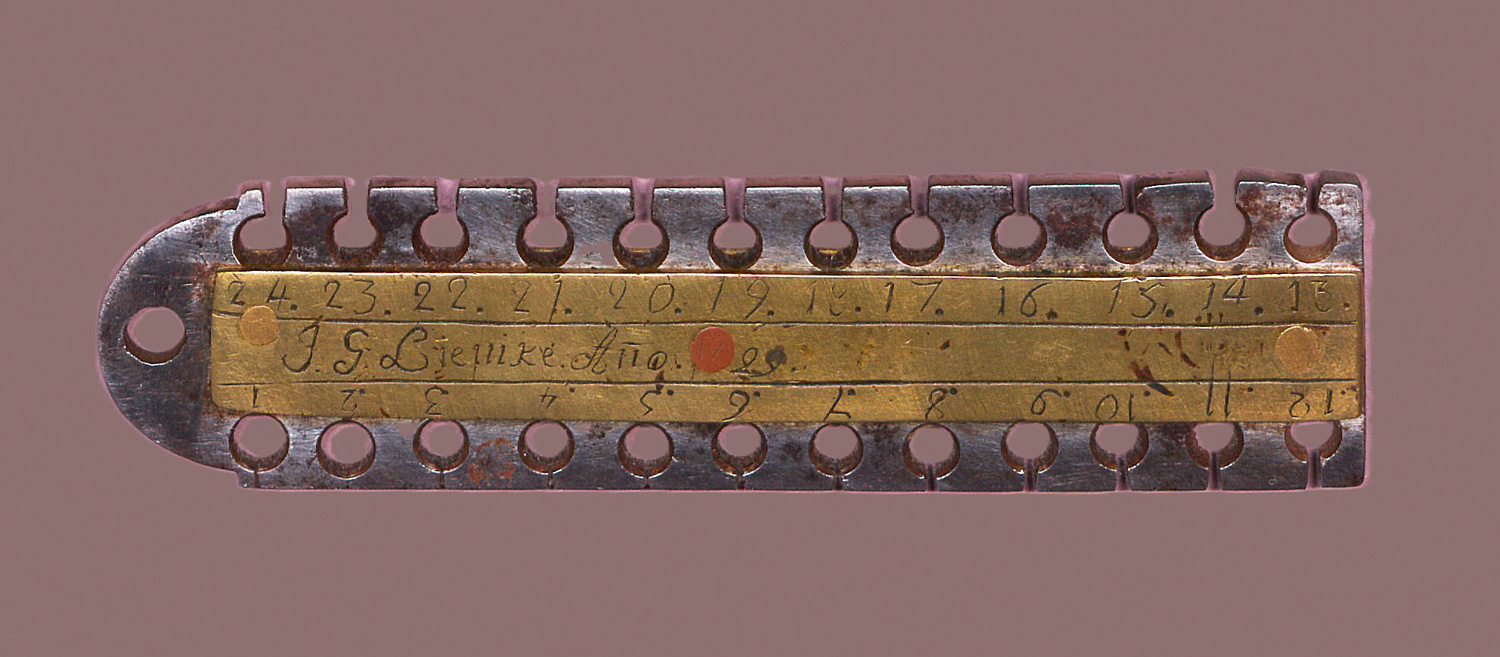 Linike, Johann Georg. Saitenmesser. Drahtstärkenmessgerät für Tasteninstrumentsaiten (Cembalo etc.). Stahlkorpus ca. 14 x 3,5 x 0,4 cm mit Bohrlöchern und Seitenauslässen in verschiedenen Stärken und an drei Kupferstiften befestigte gravierte Messingskala 12,8 x 1,7 cm. Gravursigniert "J. G. Lienike Anno 1729". (Mecklenburg-Strelitz) 1729.